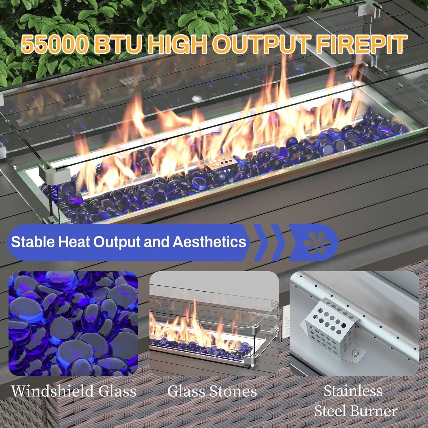 Trumbeak 9 Pieces Outdoor Patio Furniture Set with 43" 55000BTU Gas Propane Fire Pit Table & Swivel Rocking Chairs, PE Wicker Rattan Outdoor Sectional Patio Set, Outdoor Patio Conversation Set, Blue