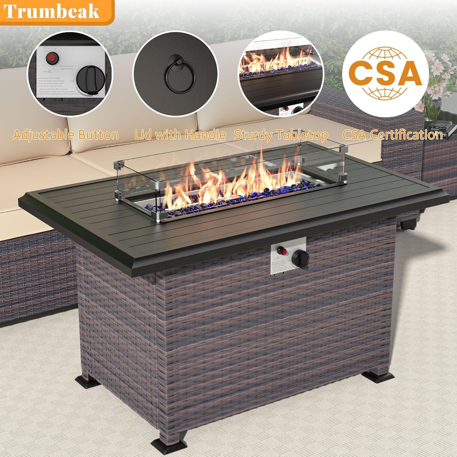 Details: The Trumbeak Premium 9-Piece Patio Set with Fire Pit Table transforms patios, gardens, or poolside areas into vibrant entertainment spaces, featuring a CSA-certified propane fire pit (55,000 BTU) with push-button ignition and stainless steel burner for safe, powerful warmth and near-zero emissions. Built for lasting durability, its powder-coated steel frame and handwoven PE wicker withstand weather while maintaining beauty. Enjoy supreme comfort with 3"-4" thick high-density foam cushions, ergonomic 27.5" backrests, and widened armrests for drinks/books—enhanced by 2 premium 360° swivel rocking chairs that let you effortlessly pivot for panoramic views or gentle relaxation. Your complete set includes: 2 corner sofas, 2 middle sofas, 2 swivel rockers, 1 side table, 1 coffee table, 1 fire pit table, and instructions—shipped in 5 secure boxes with 24-hour support for missing/damaged parts.