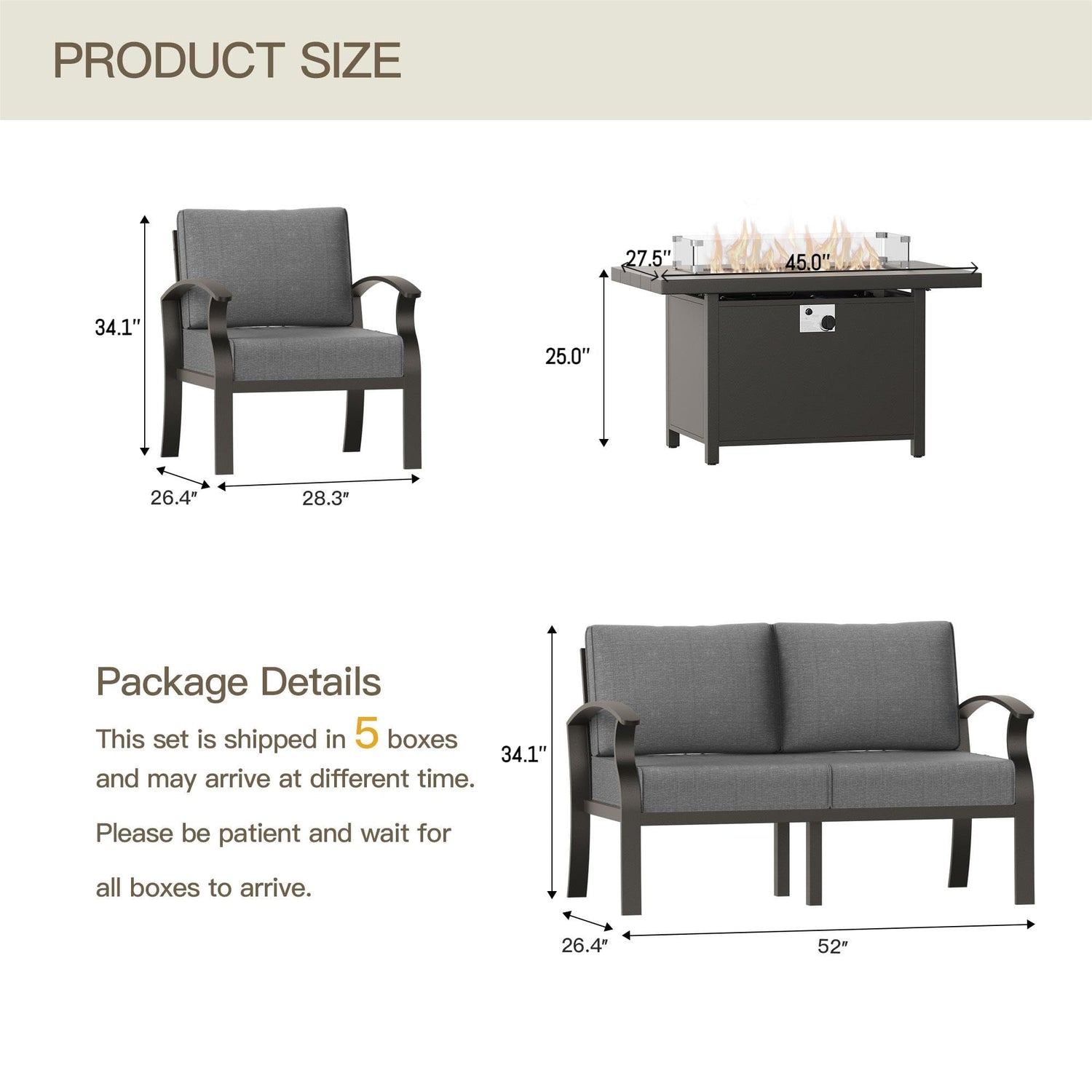 Trumbeak Aluminum Patio Furniture Set with 55,000 BTU Propane Fire Pit Table,6 Seats Metal Modern Outdoor Furniture w/5.1" Cushions,Patio Sectional w/Fire Pit for Patio,Backyard,Grey