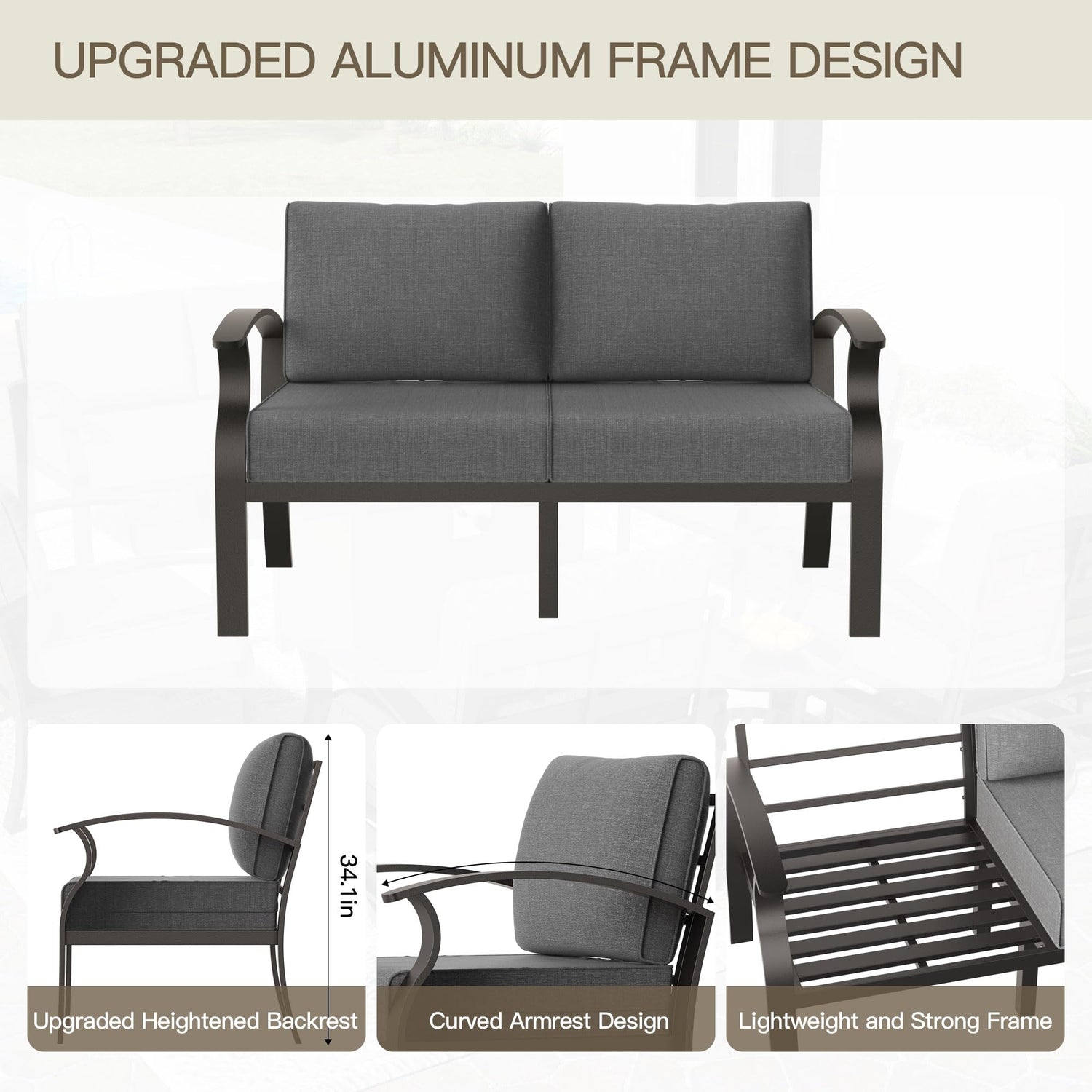 - Premium Aluminum Frame:Meticulously crafted with precision and excellence,our aluminum outdoor sofa set is constructed using high-quality aluminum material.This not only ensures durability but also makes it resistant to rust and the harshest weather conditions.With its sturdy aluminum frame,you can enjoy this set for years to come