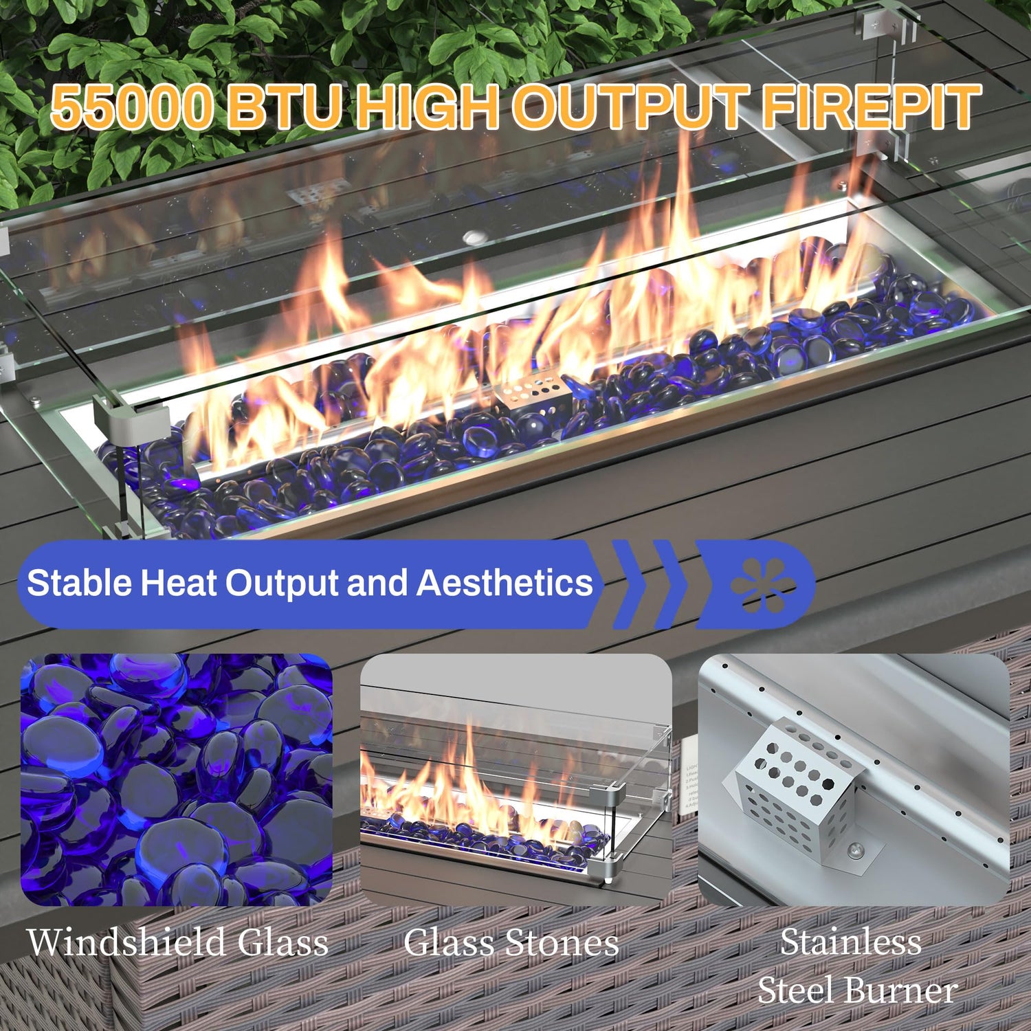 Trumbeak Patio Furniture Set with Fire Pit Table 8 Pieces Outdoor Sectional Sofa Set,PE Rattan Wicker Patio Conversation Set w/43in 55000 BTU Propane Fire Pit Table,Blue