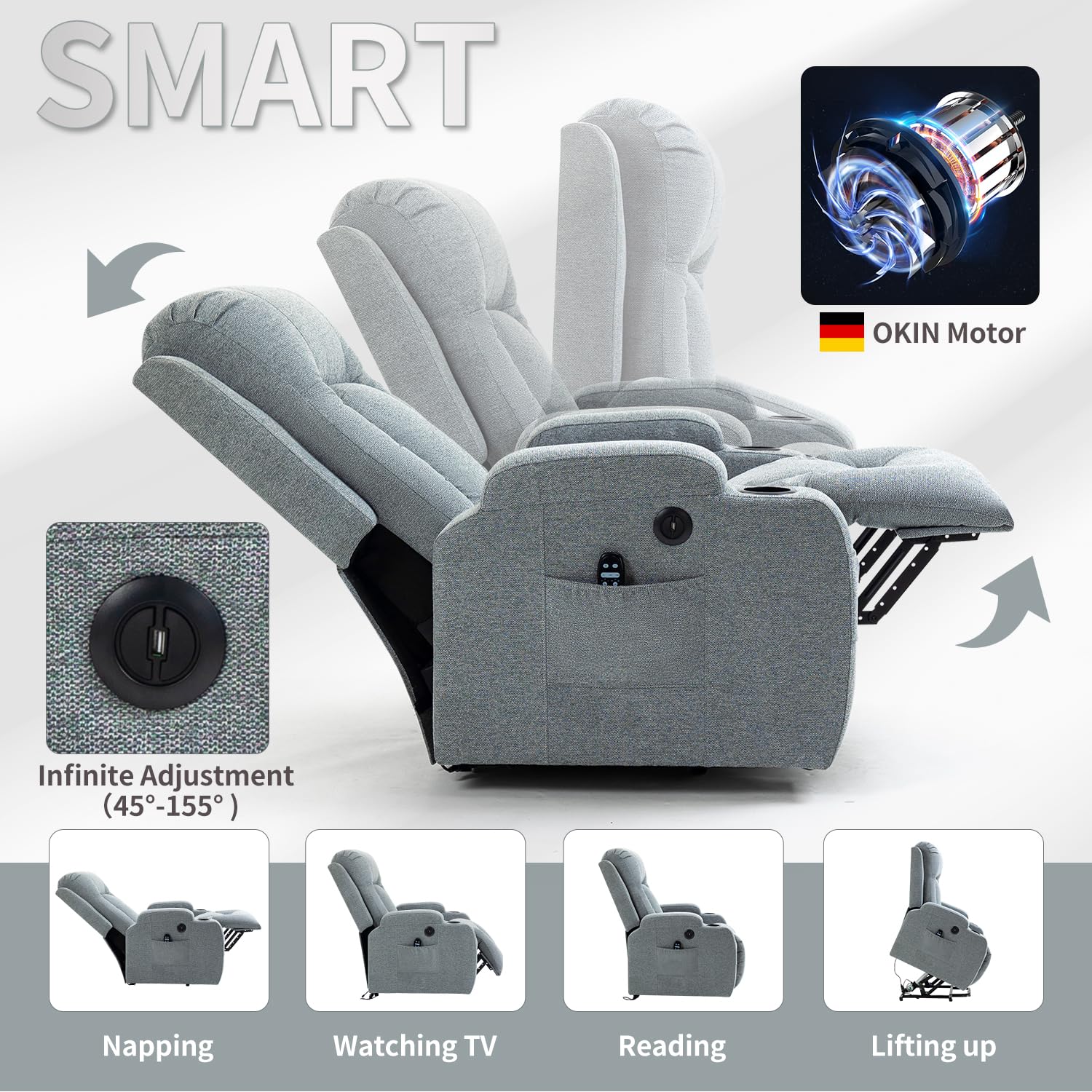 - Power Lift Recliner Chair: The power lift chair is equipped with a premium powerful motor, which can help the people stand up easily without adding stress to the back or knees by pushing the entire chair up. At the same time, you can get any reclining position you want between 45 and 155 degrees by pressing the side buttons. Therefore, it is perfect for adults who are salarymen, massage enthusiasts, people recovering from the surgery, and the elderly.