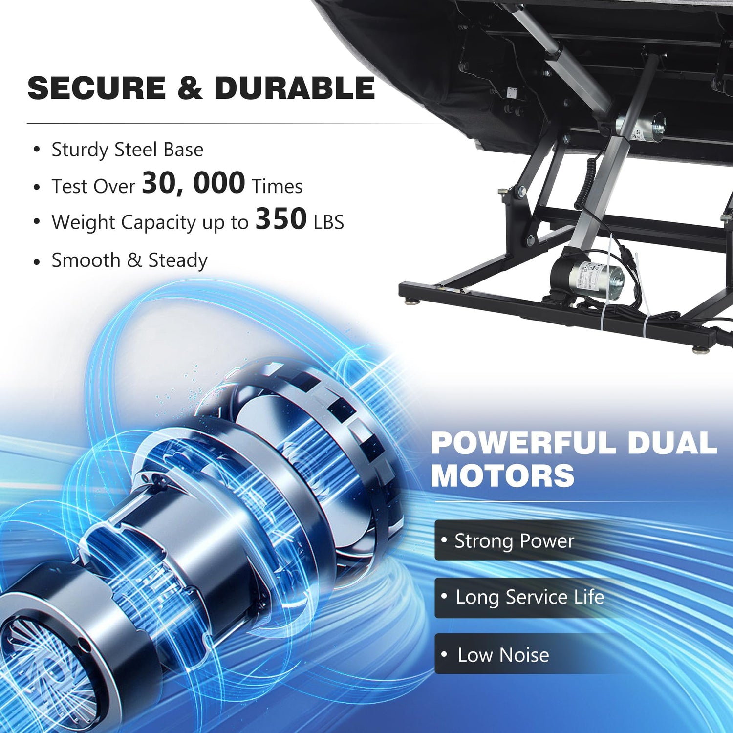 - 【Powerful Dual Motors】- What's the difference between the dual motors and the single motor for the lift chair? The dual motor recliner chair's backrest and footrest can work independently, and its backrest can recline to 180° for comfortable sleeping or to any customized position you prefer. Furthermore, the power lift chair also can help the senior stand up easily without adding stress to the back or knees. Pressing the 'HOME' button, the chair will restore to its upright position.