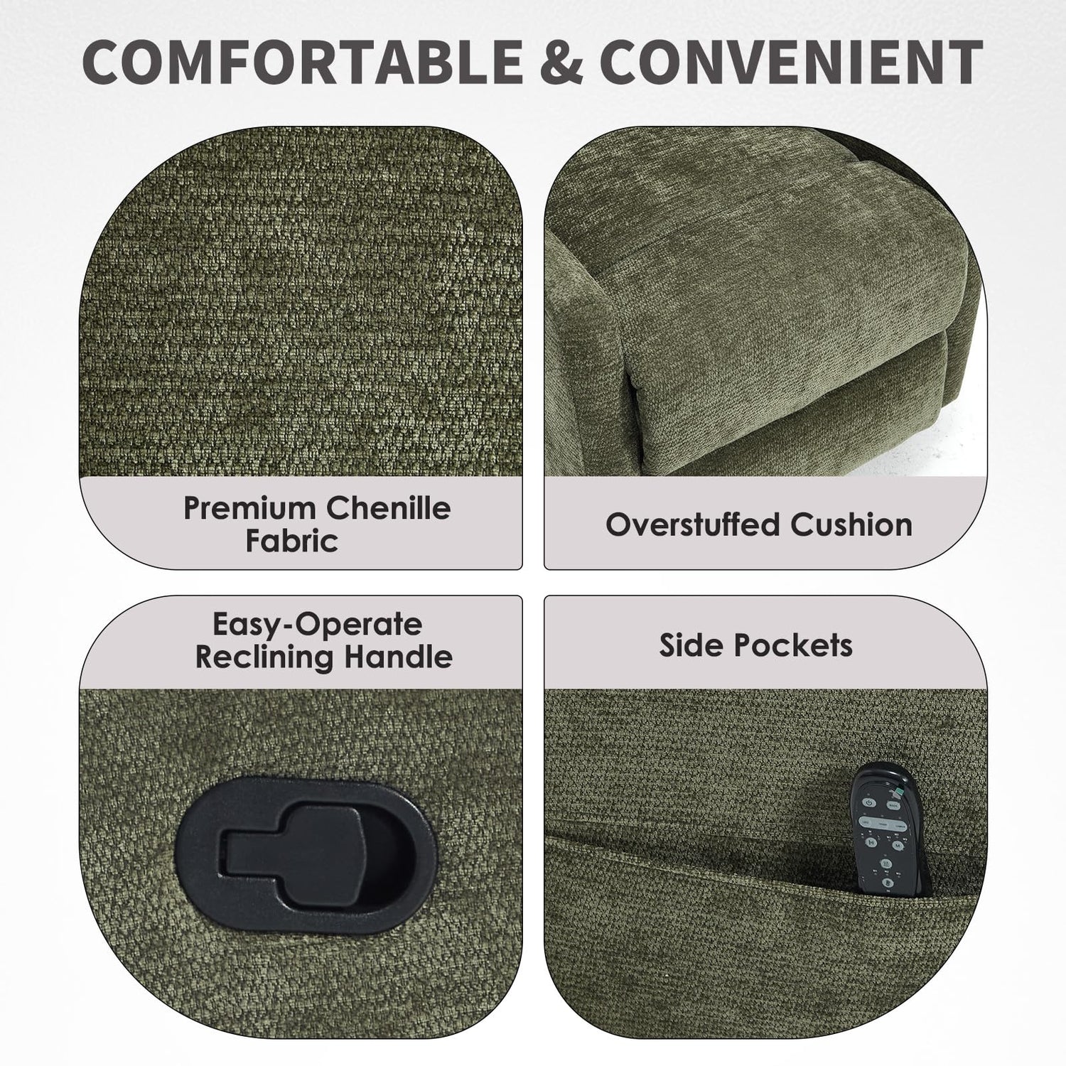 - 【Quality & Comfortable】- The swivel glider recliner is overstuffed with high-density sponge, which gives you a ultimate sense of softness. The manual swivel rocking chair is upholstered with high-quality chenille fabric, which is durable, breathable, quick-drying, and elegant, with a good touching. The metal frame base features a tipping-proof design, with a large load-bearing capacity up to 350lb, durable and secure enough to support a adult man.