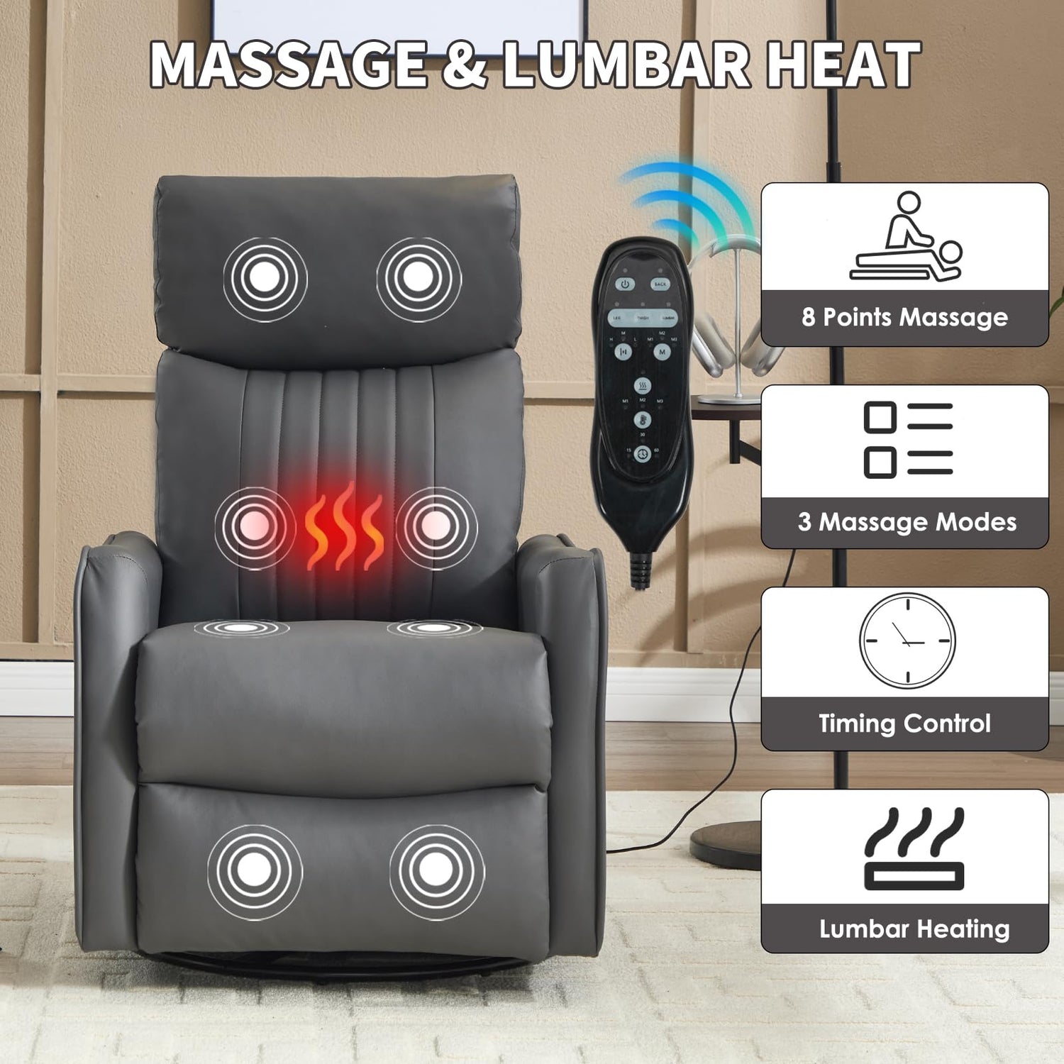 Trustyue Swivel Rocker Recliner Chair, 360° Swivel Recliner with Heat and Massage, Rocker Recliner Nursery Glider Chair with Side Pockets for Living Room (Grey, Faux Leather)