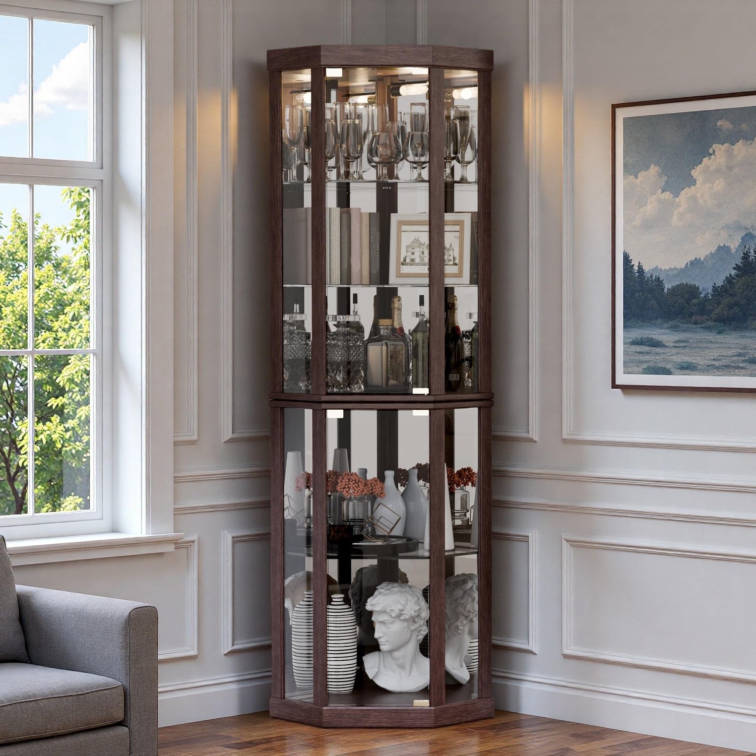 Details: Trygoal Lighted 3-Side Glass Display Curio Cabinet, Corner China Cabinet with Tempered Glass Doors, Wooden Display Case with Light Bulb for Living Room, Dark Cherry
