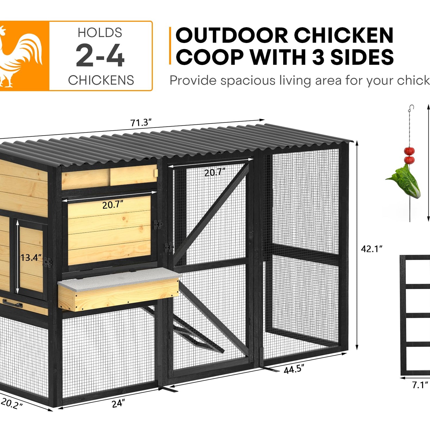 • 【Spacious Area for 2-4 Chickens】Measuring 71.3’’L x 20.2”W x 44.1’’H, our wooden chicken coop offers ample indoor and elevated run space, comfortably housing 2-4 chickens. They will have plenty of room to roost, nest, and move around naturally while feeling safe and relaxed.