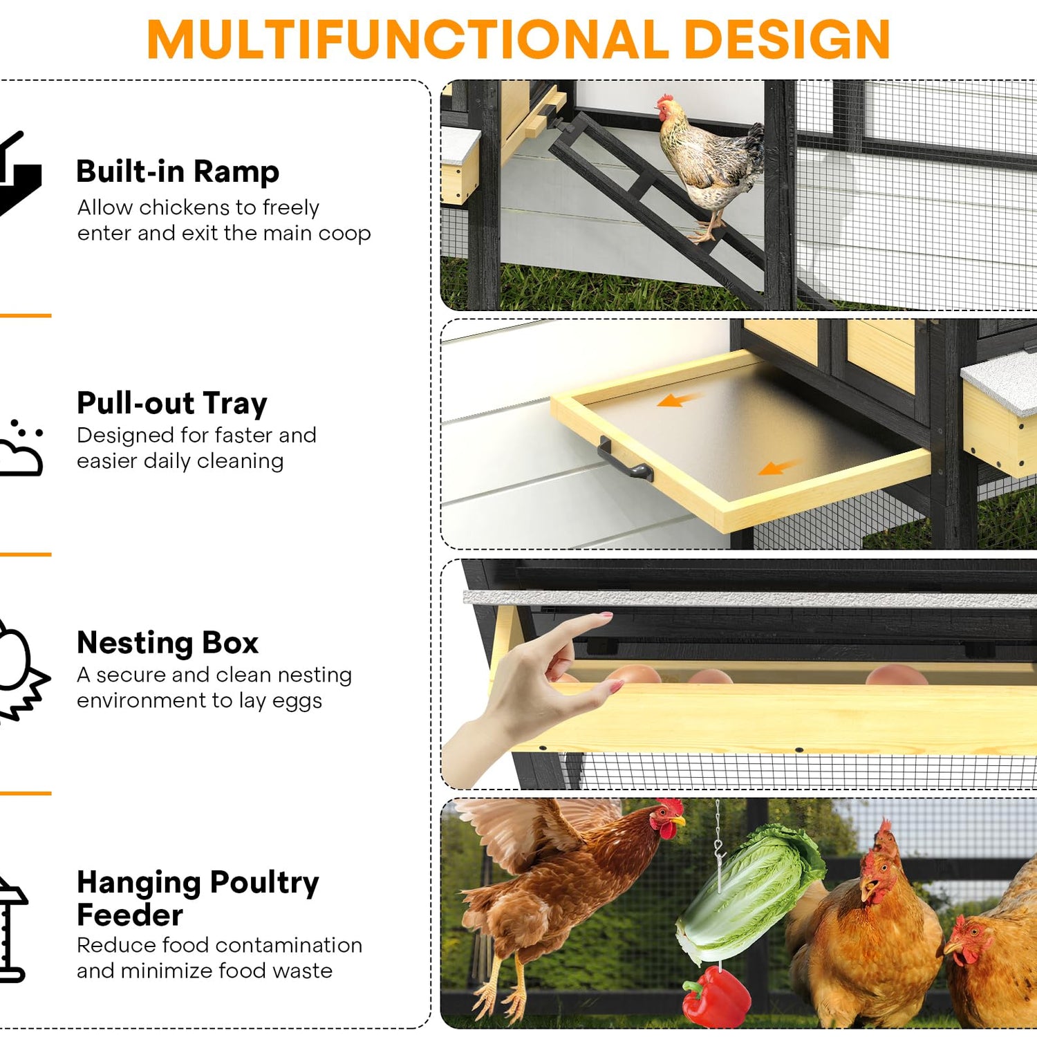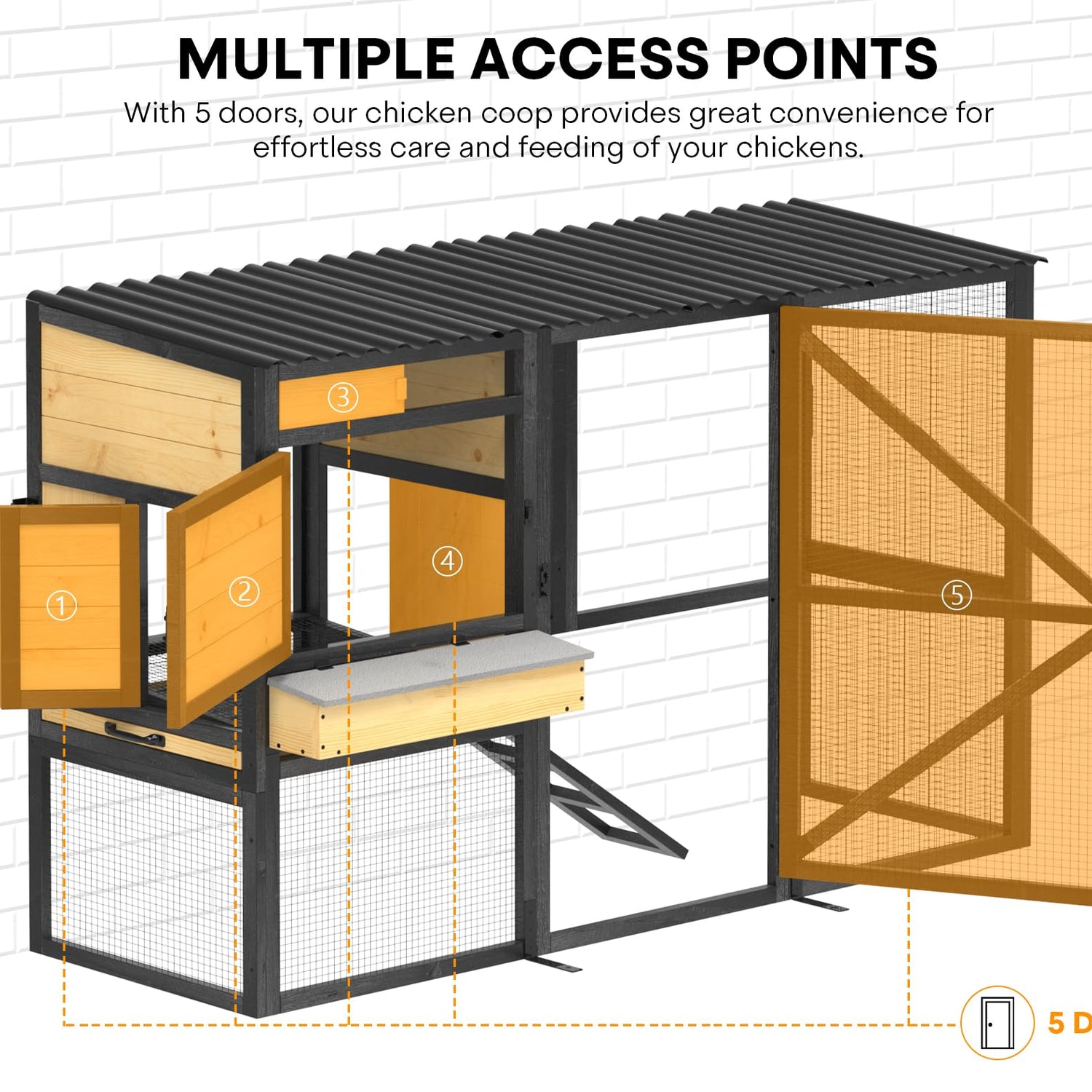 • 【Unmatched Accessibility with 5 Access Points】Featuring five doors, our hen house offers unparalleled freedom for your chickens to enter, exit, and explore without crowding. This multi-access design significantly reduce aggression and makes it incredibly easy for you to reach in for feeding, cleaning, and collecting eggs.