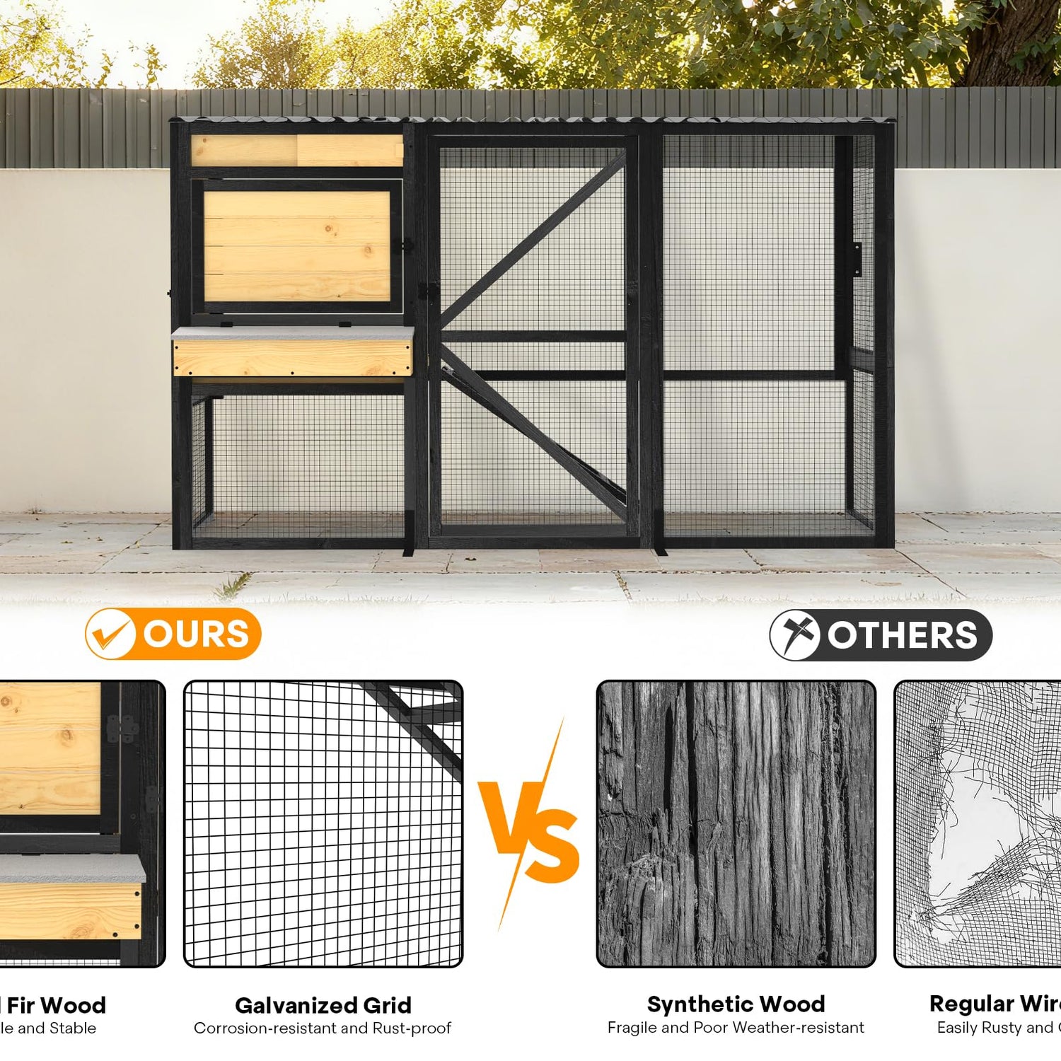 • 【Durable & Weather-Resistant Material 】Crafted from naturally weather-resistant fir wood and durable, rust-proof galvanized wire mesh, our chicken coop ensures superior durability. The combination provides optimal protection against the elements while maintaining a dry and comfortable environment for your flock.