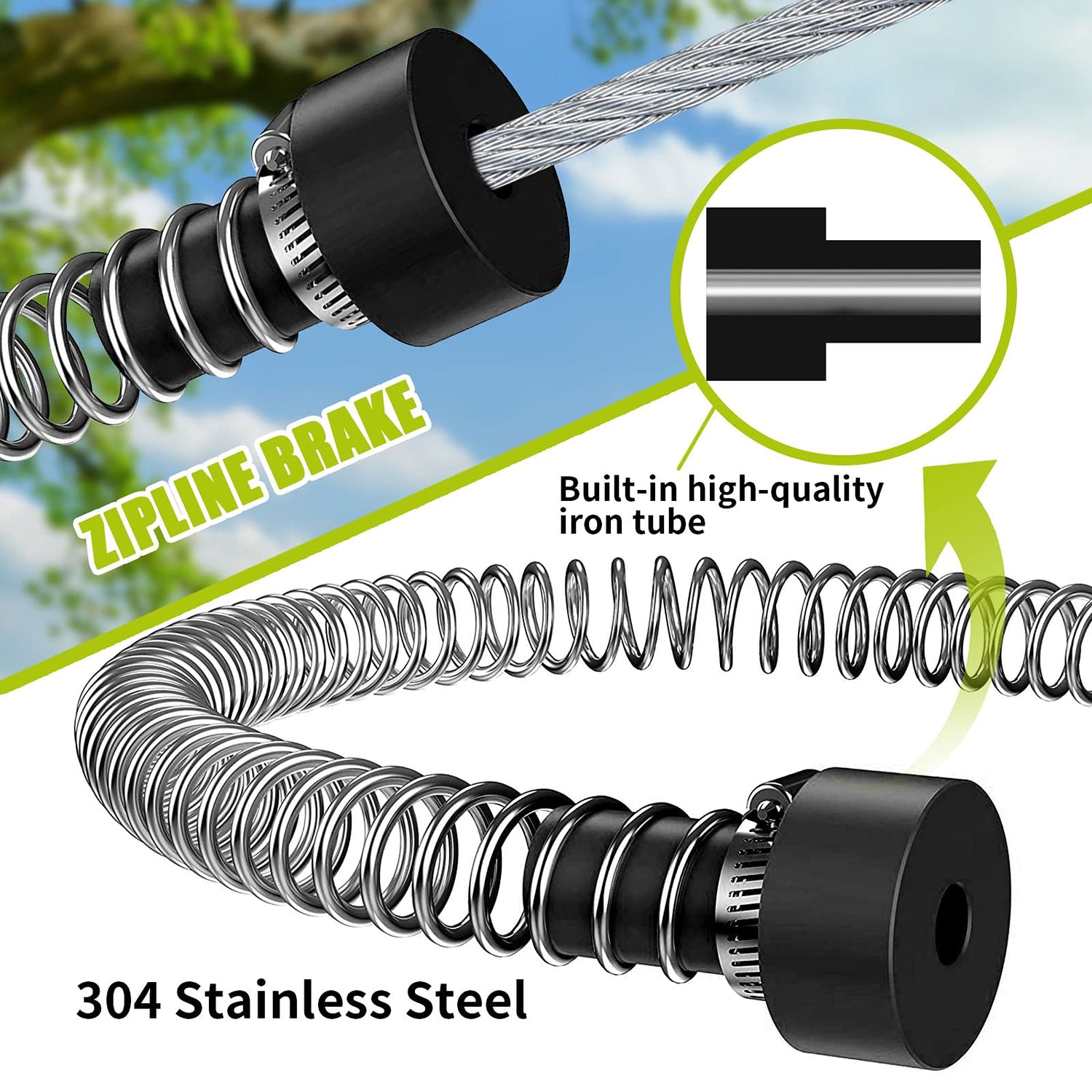- 【6.5FT SUS304 Stainless Steel Spring Brake System】 Unlike other ordinary springs on the market, our springs are made of heat-treated stainless steel spring steel, which is not easy to rust. Our rubber plug has a built-in high-quality iron tube, which can prevent the cable from rubbing the plug for a long time, which will cause the plug to break, so the zip line kit will not suddenly stop! Spring brakes can effectively ensure a safe distance between your child and the trees to ensure security!