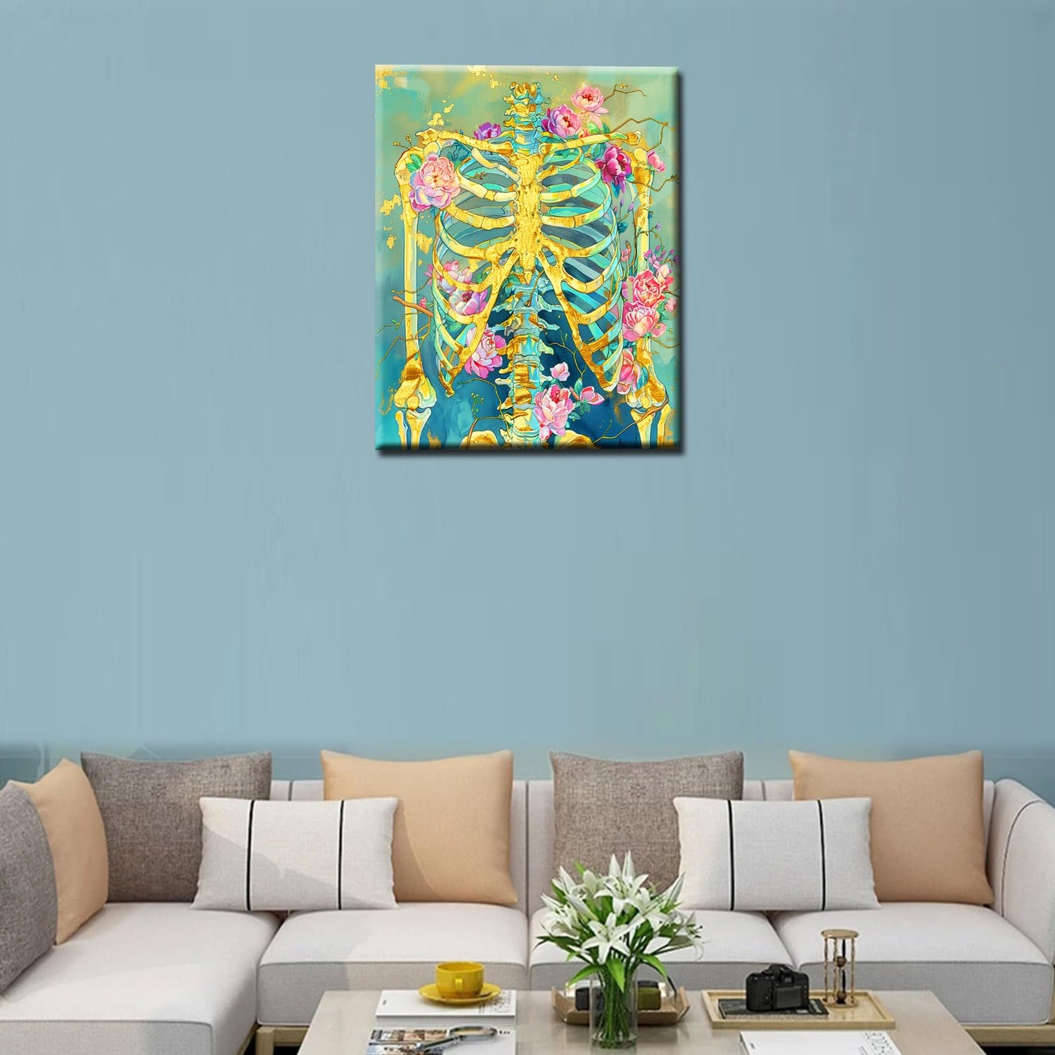 Tucocoo Golden Skeleton Paint by Numbers for Adults Beginners Paint by Number Pink Flowers Bone DIY Acrylic Paint by Numbers Kits on Canvas Drawing Paintworks Artwork Home Wall Art 16x20inch No Frame