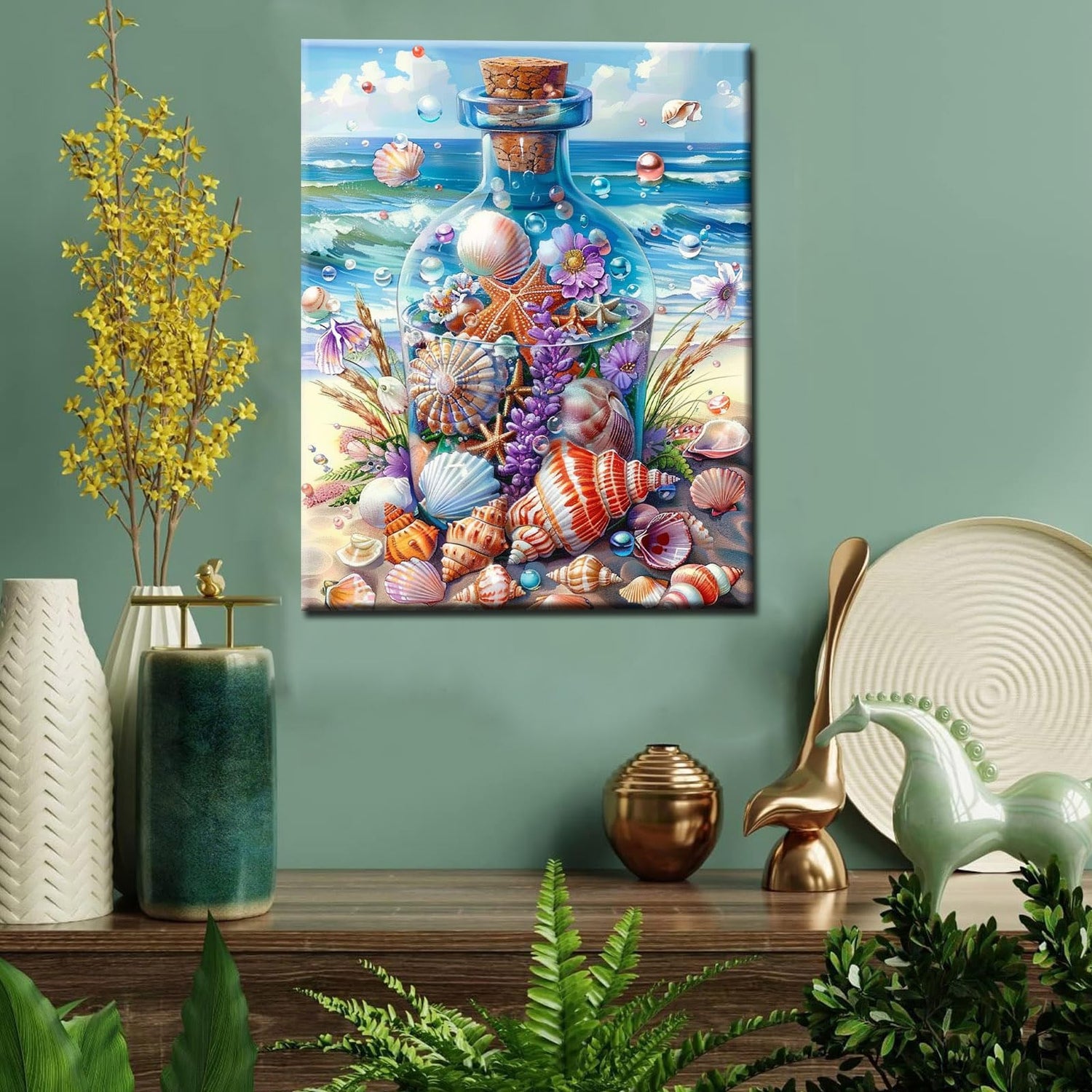 Tucocoo Seaside Bottle Shells Scene Paint by Numbers Kits 16x20 inch Canvas DIY Oil Painting for Adults Beginner with Brushes and Acrylic Pigment - Beach Sea Waves Scenery Seashells(Without Frame)