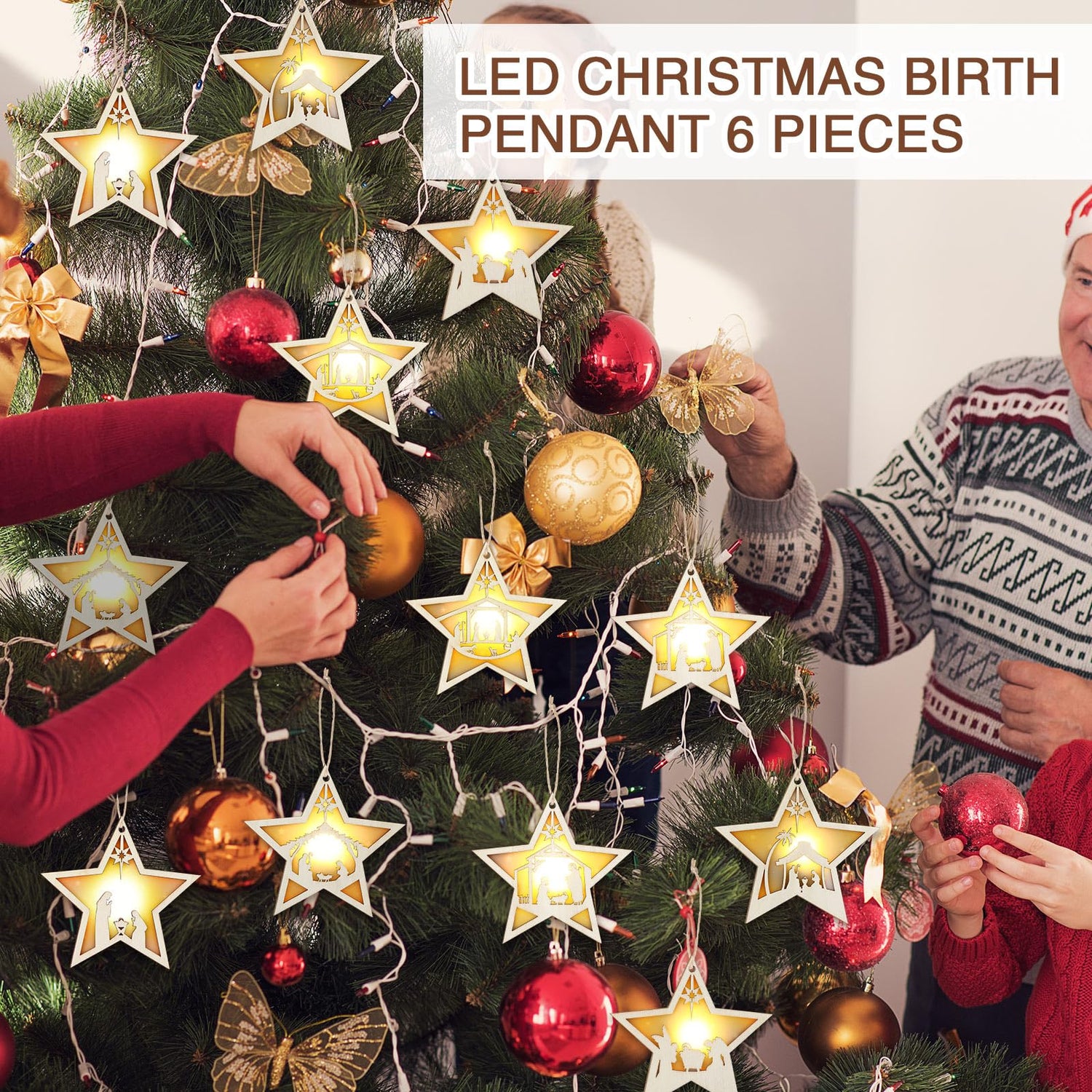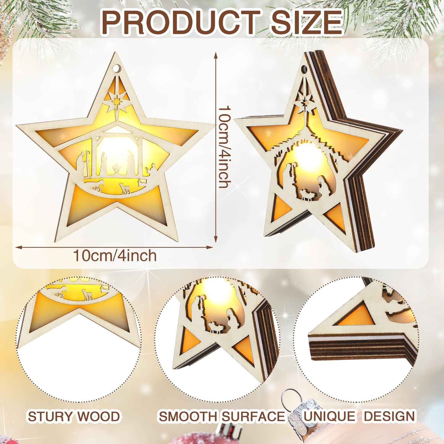 Tujoe 6 Pcs Christmas Nativity Scene Ornament LED Light up Nativity Christmas Ornament Cutout Jesus Wood Acrylic 3D Cut Nativity Wooden Set Christmas Hanging Ornament for Xmas Tree Decorations (Star)