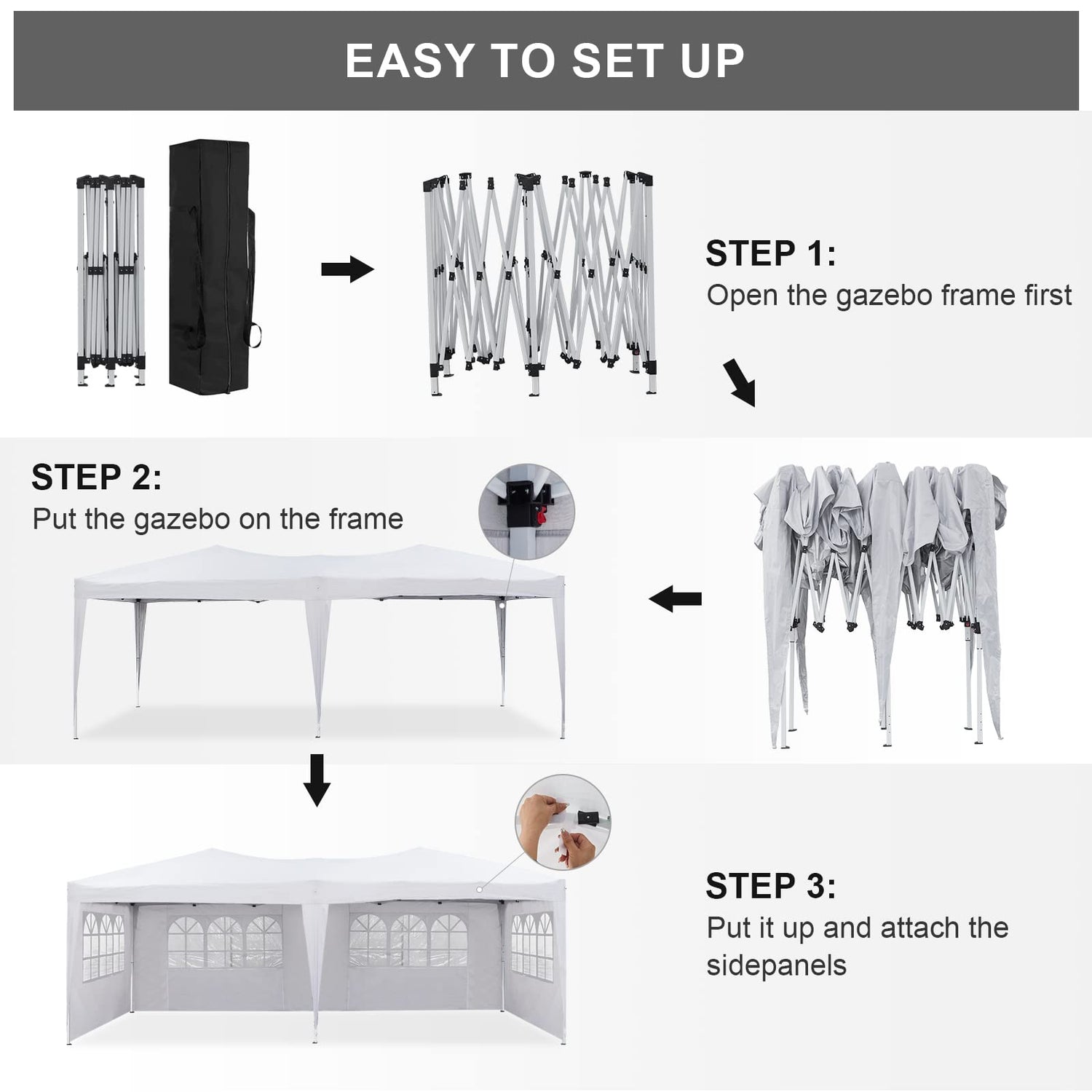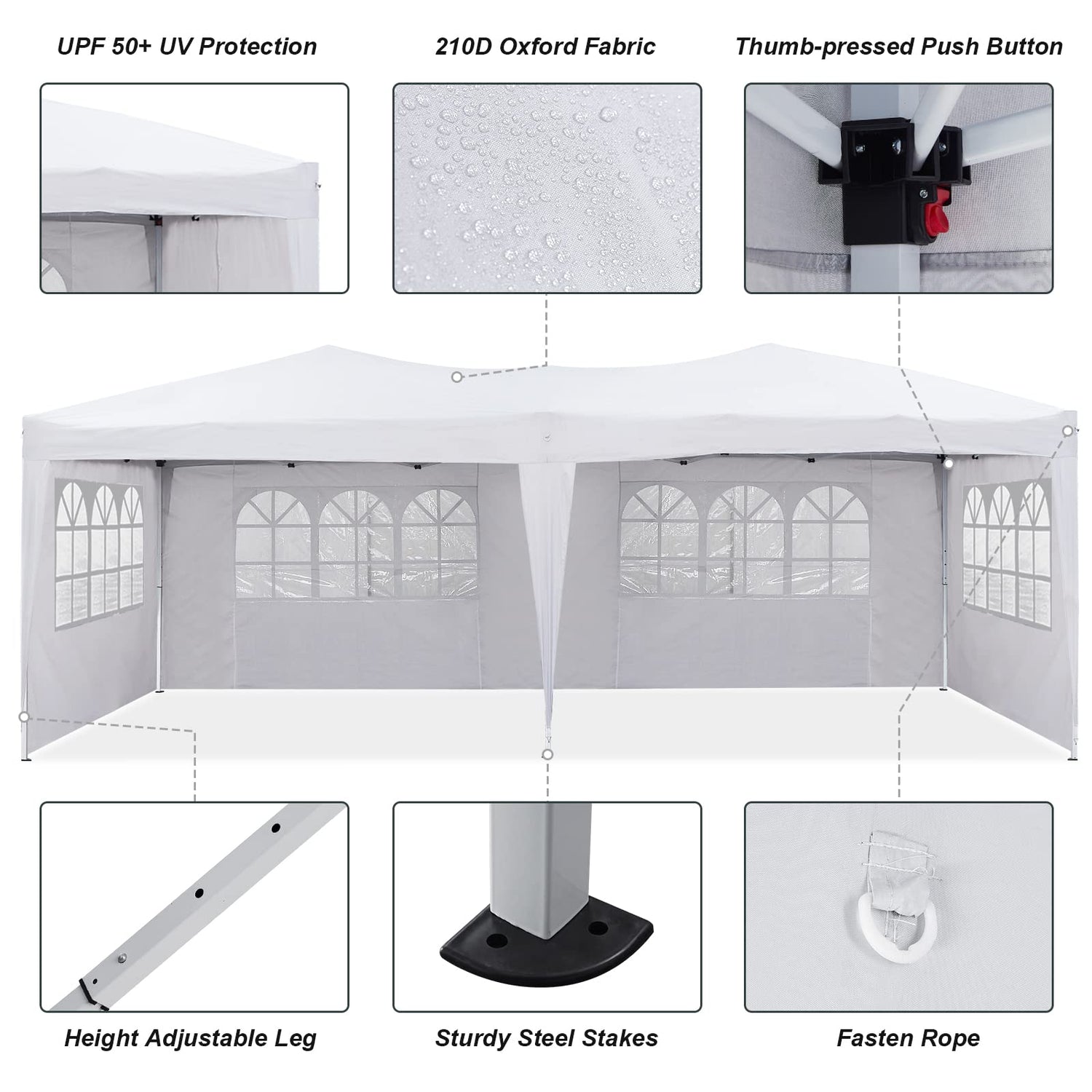 - đȘă3 Adjustable HeightăThree different height settings allow you to choose the height that meets your needs. 3 Leg Height Positions: High 6.3ft, Medium 6.0ft, Low 5.7ft. Overall Dimension: 10 x 20 ft (3m*6m). The gazebo offers a great space for entertaining and protection from unsettled weather for 10-15 persons. receptions, Wedding. Guy ropes and ground pegs to secure the garden gazebo to the ground. Bag included to carry.
