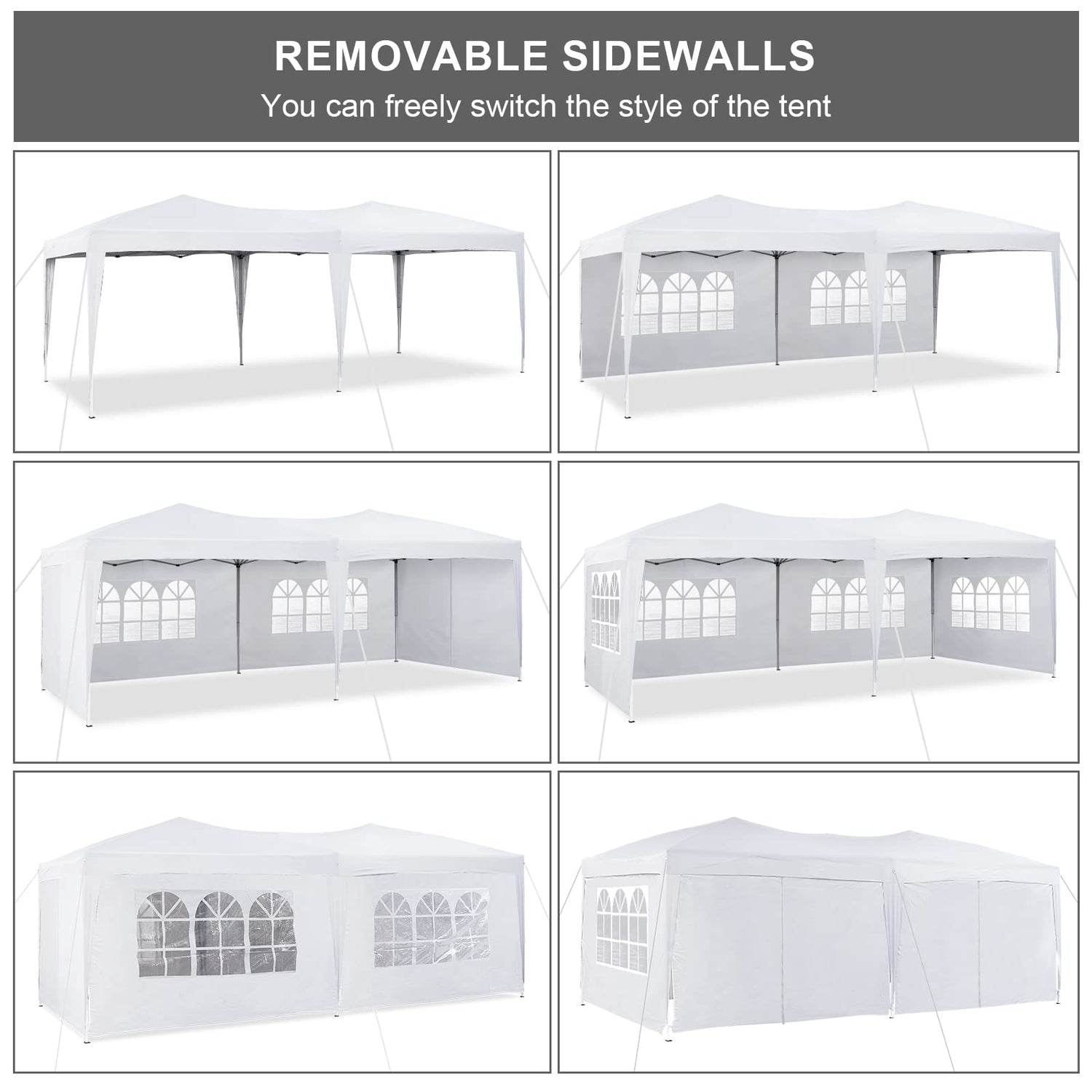 - đȘă6 Removable Sidewallsă4 sidewalls with windows and 2 door panels with zippers. These sidewalls are removable, so you can freely switch the style of the tent. You can install without sidewalls as a large sunshade shelter for your family and guests, you can also install with all sidewalls as a temporary garage to store car, garden furniture and tools.