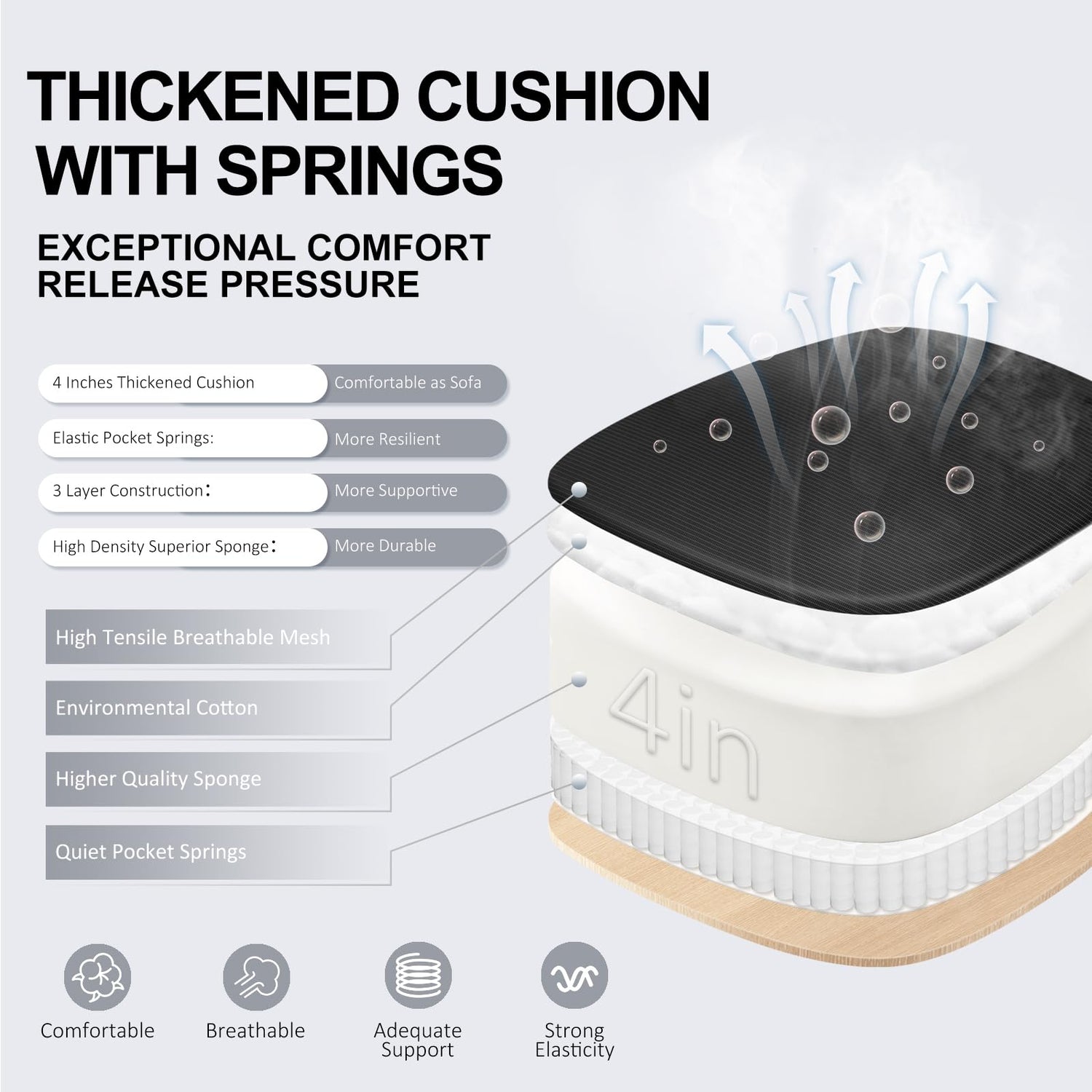 - 【Unmatched Comfort for Long Hours】The office chair provides ultimate comfort for its 4 inches extra thick padded cushion with high quality supportive sponge and pocket springs used in sofas inside.Elastic,comfortable as a sofa and resistant to collapse.The ultra thick seat cushion and spring support can greatly distribute pressure,allowing you to work all day without feeling uncomfortable.And its large seat cushion :21.2" W x 20.5"D is also suitable for various sitting positions.