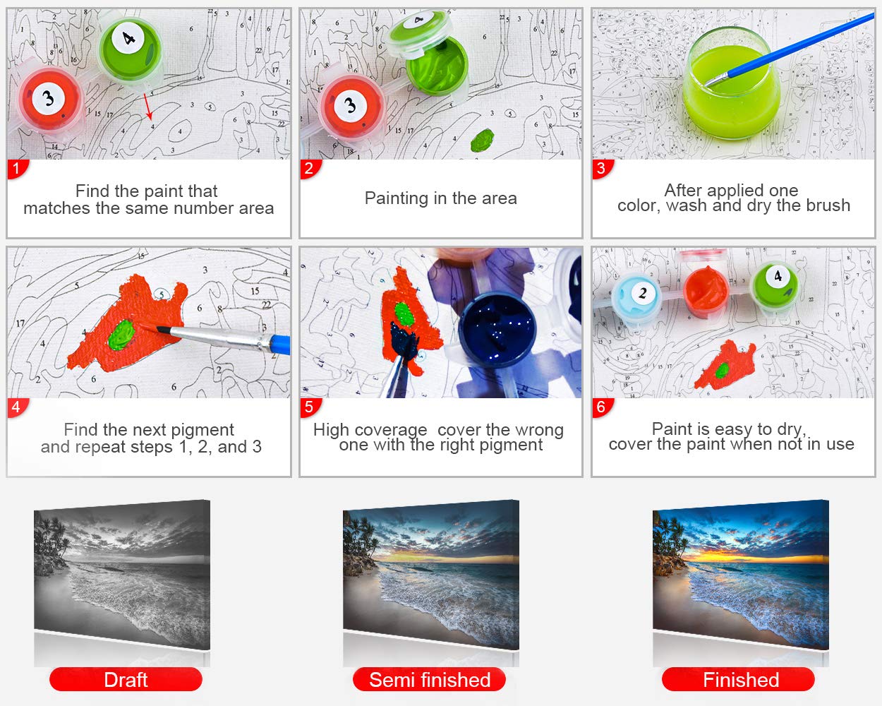 - 【Easy to Paint】Paint by numbers suitable for all skills levels adults. You only match the numbers of the paint and the figures on canvas to fill in the paint. Finish the painting one by one.
