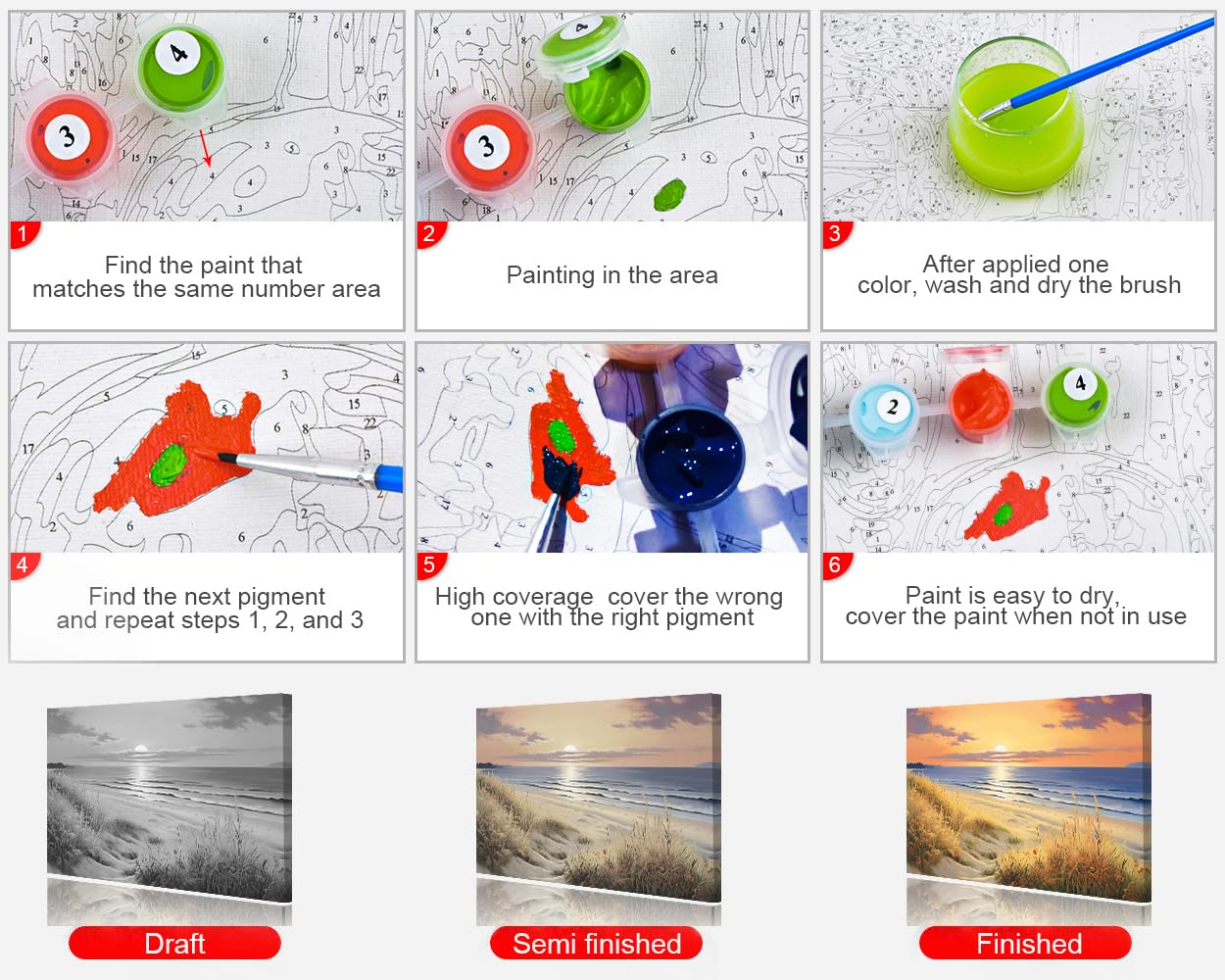 - Easy To Paint: You just need to match the numbers on the canvas with the numbers on the paint, then numerical order to fill the canvas or determine the drawing order based on your preferences. After finished, wait for the paint to completely dry before hanging it in the position you want to hang.