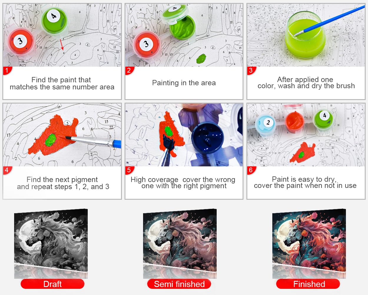- 【How to Paint】You only match the numbers of the paint and the figures on canvas to fill in the paint. Then choose the right size brush to paint and finish the painting step by step. Have fun painting.