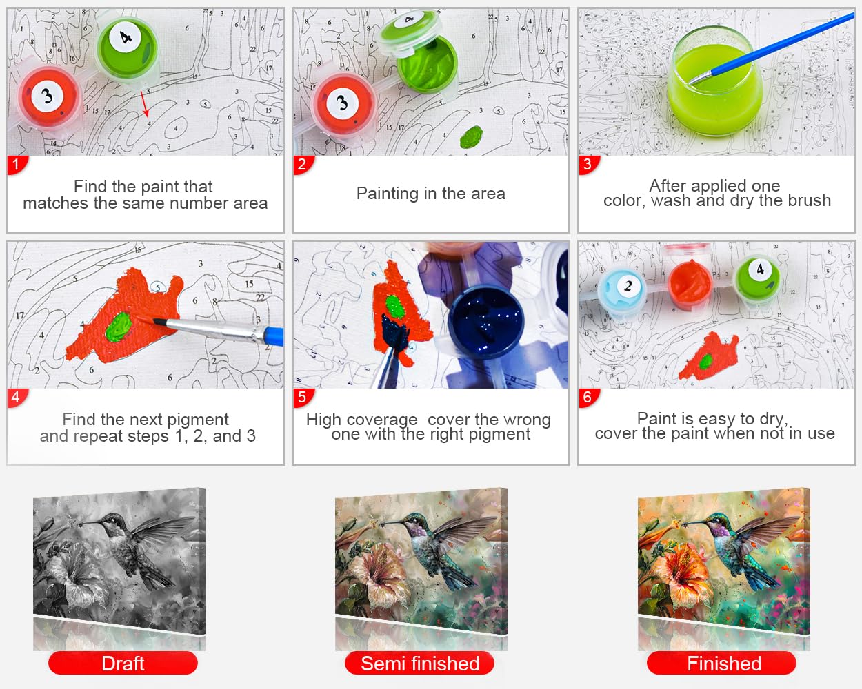 - Paint by Numbers Kit: Includes a 16'' x 20'' unframed canvas, three painting brushes, a set of pigment colors, and a reference image. DIY paint by numbers kits will make you feel the charm and fun of art.