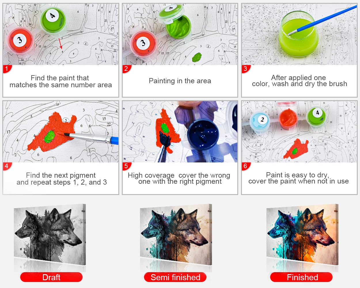 - Easy To Be A Painter: Paintings are simple and easy to draw, not complicated, and can be easily handled by children, adults, and the elderly. Two easy steps to complete a painting, first: dip the paint. Second: paint the corresponding numbers on the canvas.