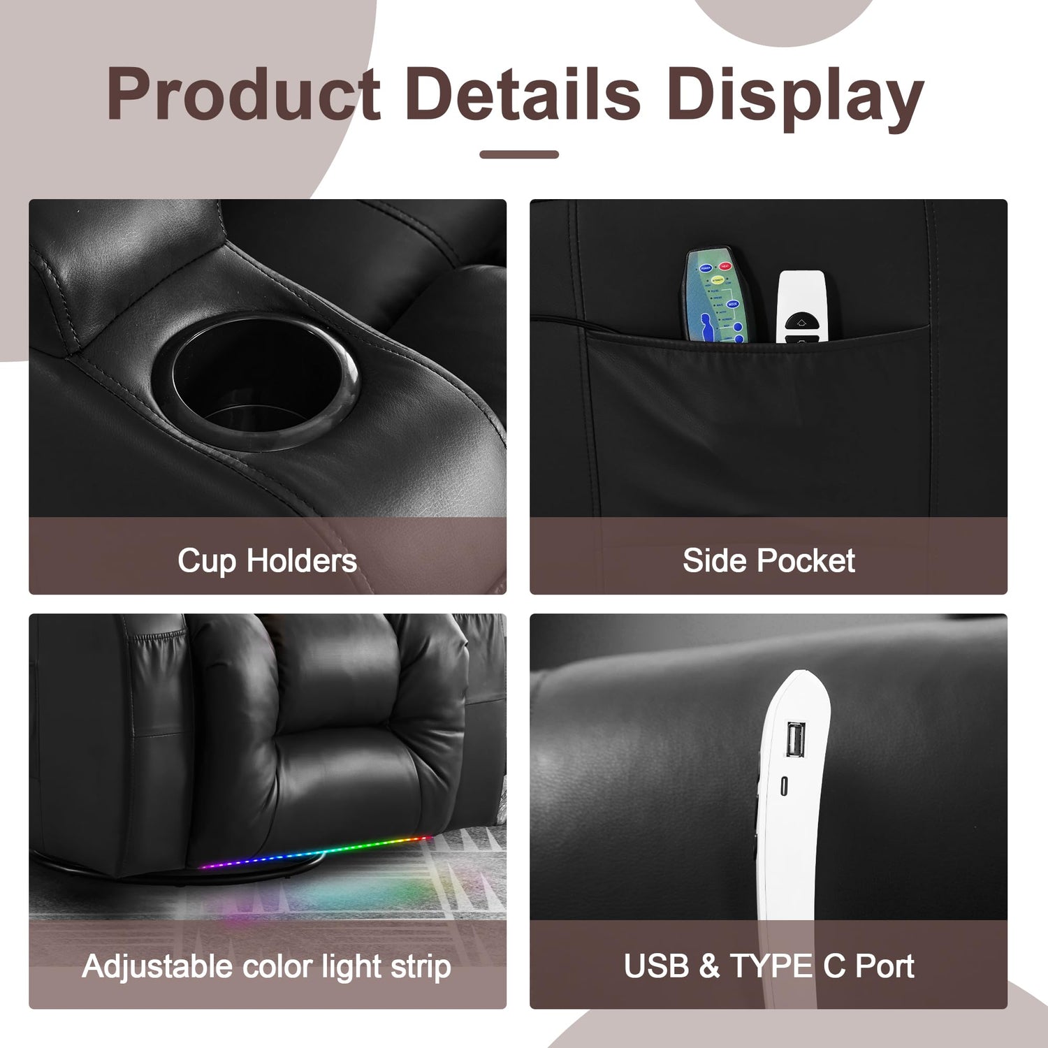 TUNYI Power Recliner Chair - Faux Leather Home Theater Seating Glider Reclining Sofa with Massage & Heat Swivel Rocker Recliner Chair for Living Room with LED Light/USB Port/Lumbar Pillow (Black)