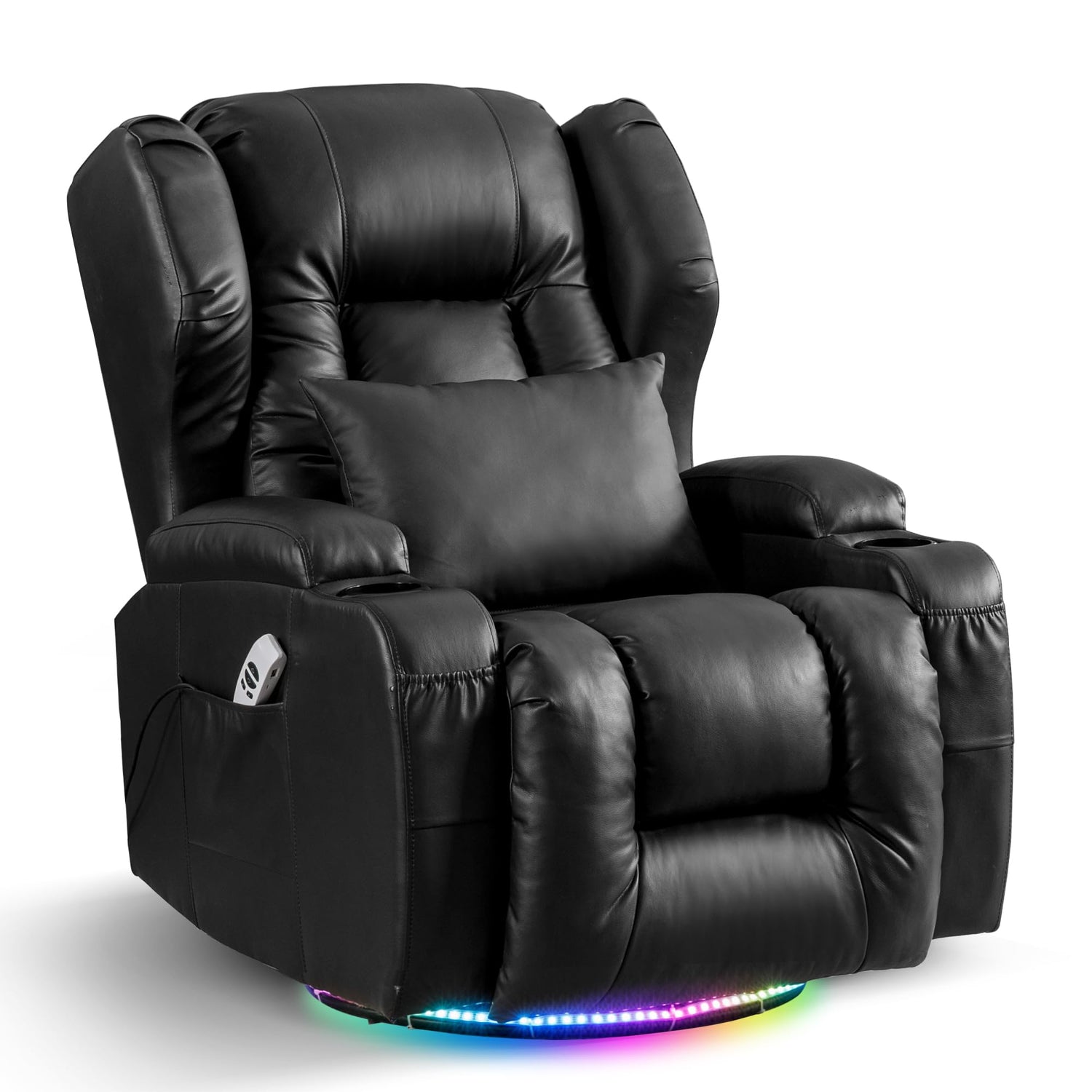 TUNYI Power Recliner Chair, Swivel Rocker Recliner Chair with Massage & Heat Faux Leather Home Theater Seating Rocker Reclining Chair for Living Room with LED Light/USB Port/Lumbar Pillow (Black)