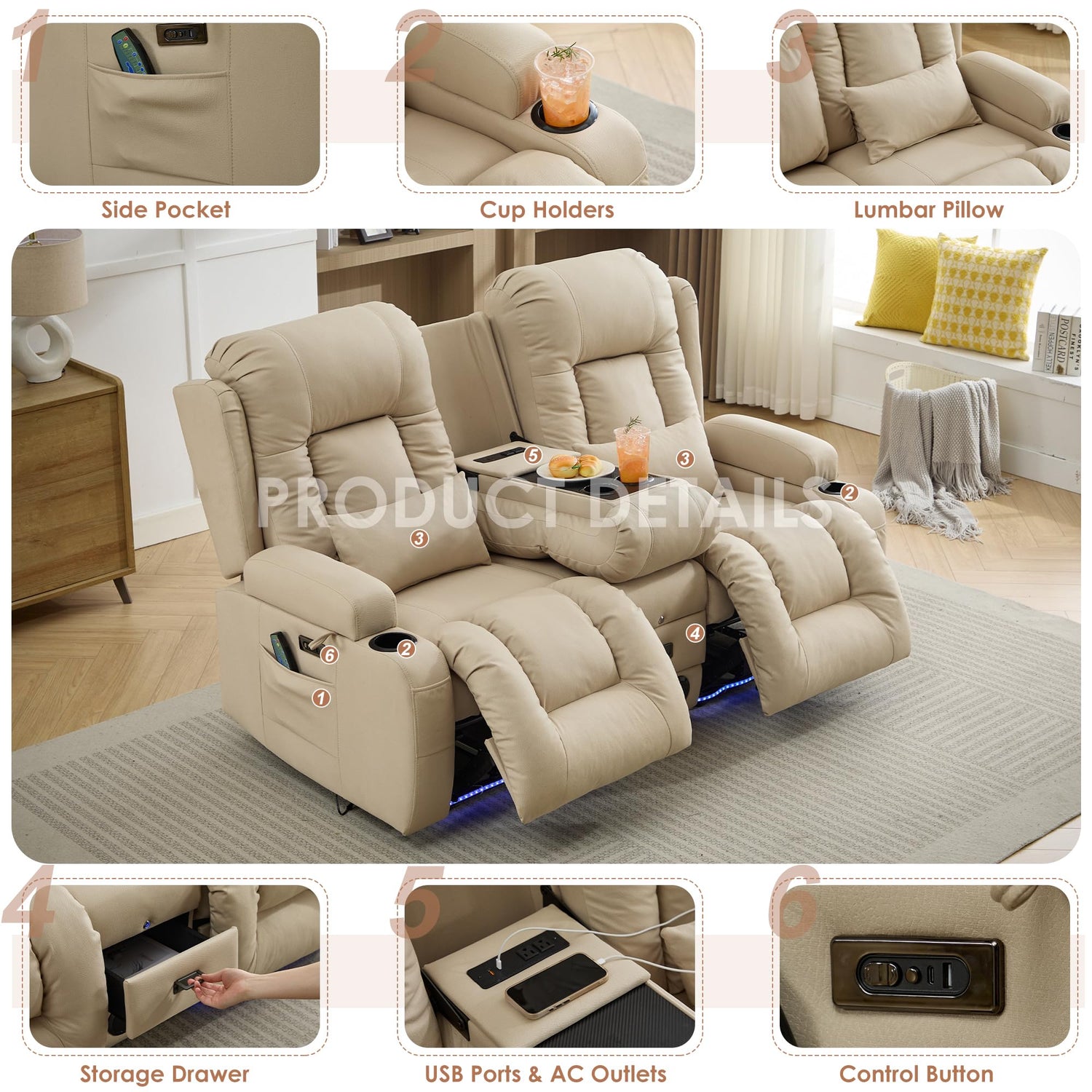 TUNYI Wall Hugger Power Loveseat Recliner - Reclining Loveseat with Console Theater Seating RV Recliner Sofa with USB/Outlet/Speaker/Cup Holder/LED Light/Storage (Beige)
