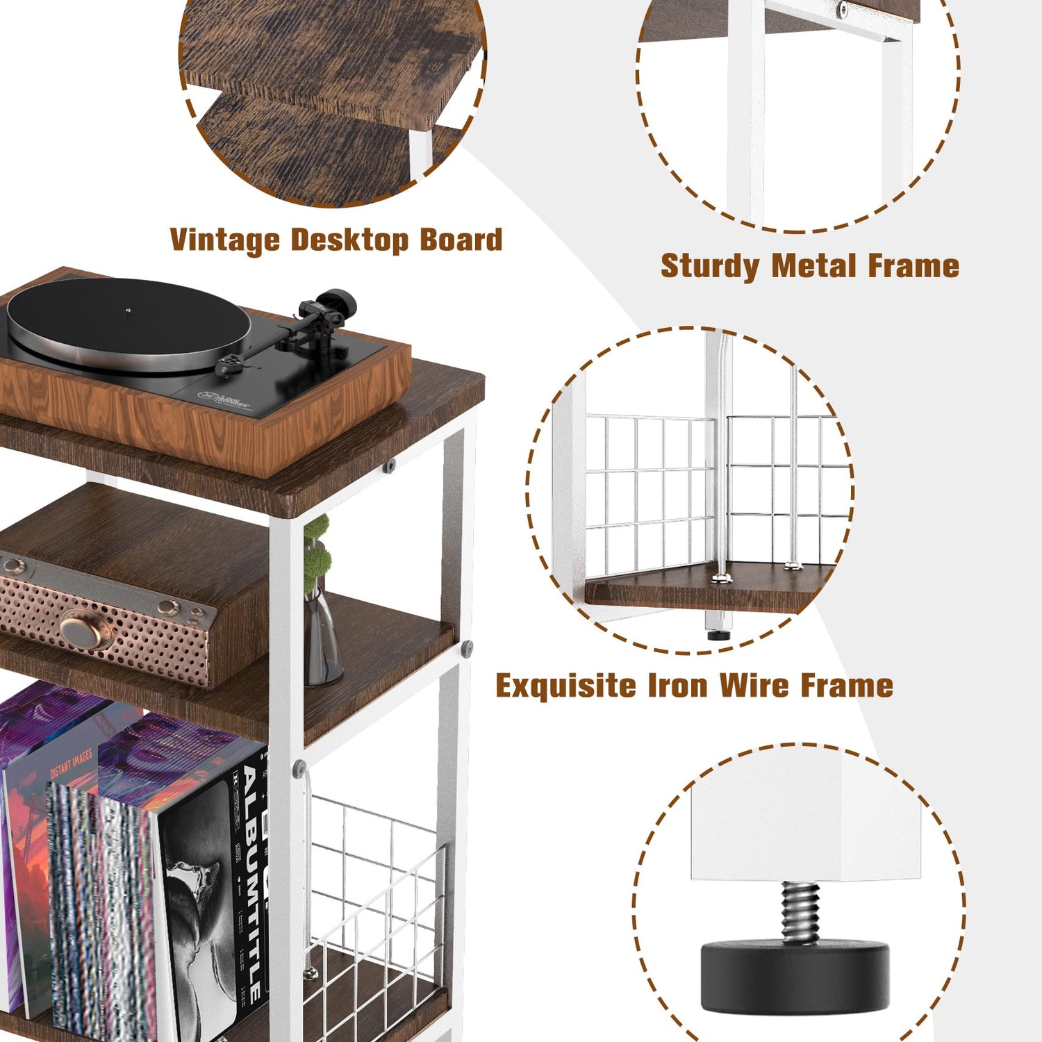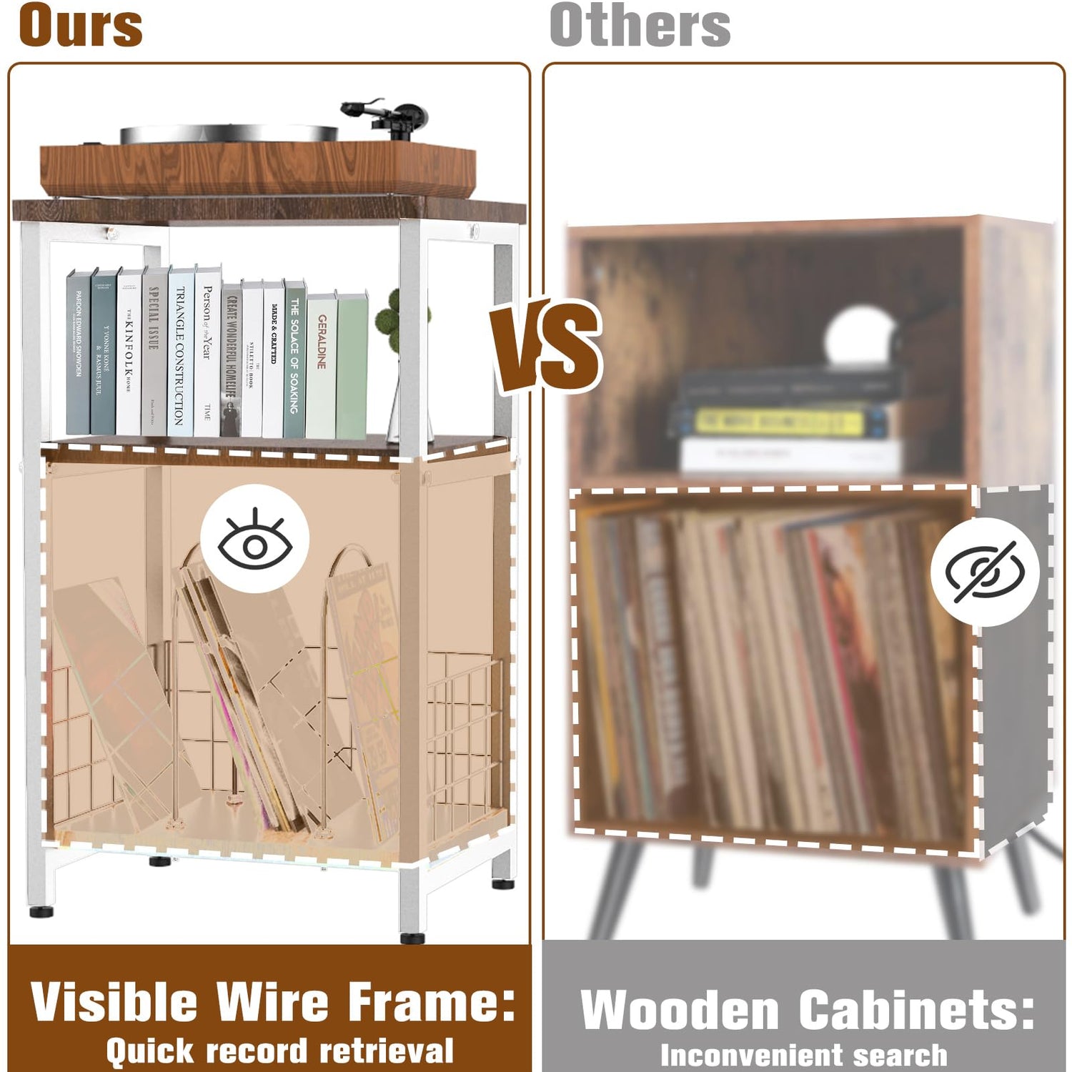 - Aesthetic Appearance & Practical: This record player table is a visual masterpiece that blends into any interior setting. With its vintage design and modern accents, it enhances the aesthetic appeal of your room, while complementing modern décor trends seamlessly. The second layer has an open design, which is convenient for access. It can store snacks, books, or other items within reach. The third layer Iron wire frame and U-shaped wire can protect your vinyl records from falling or slipping.