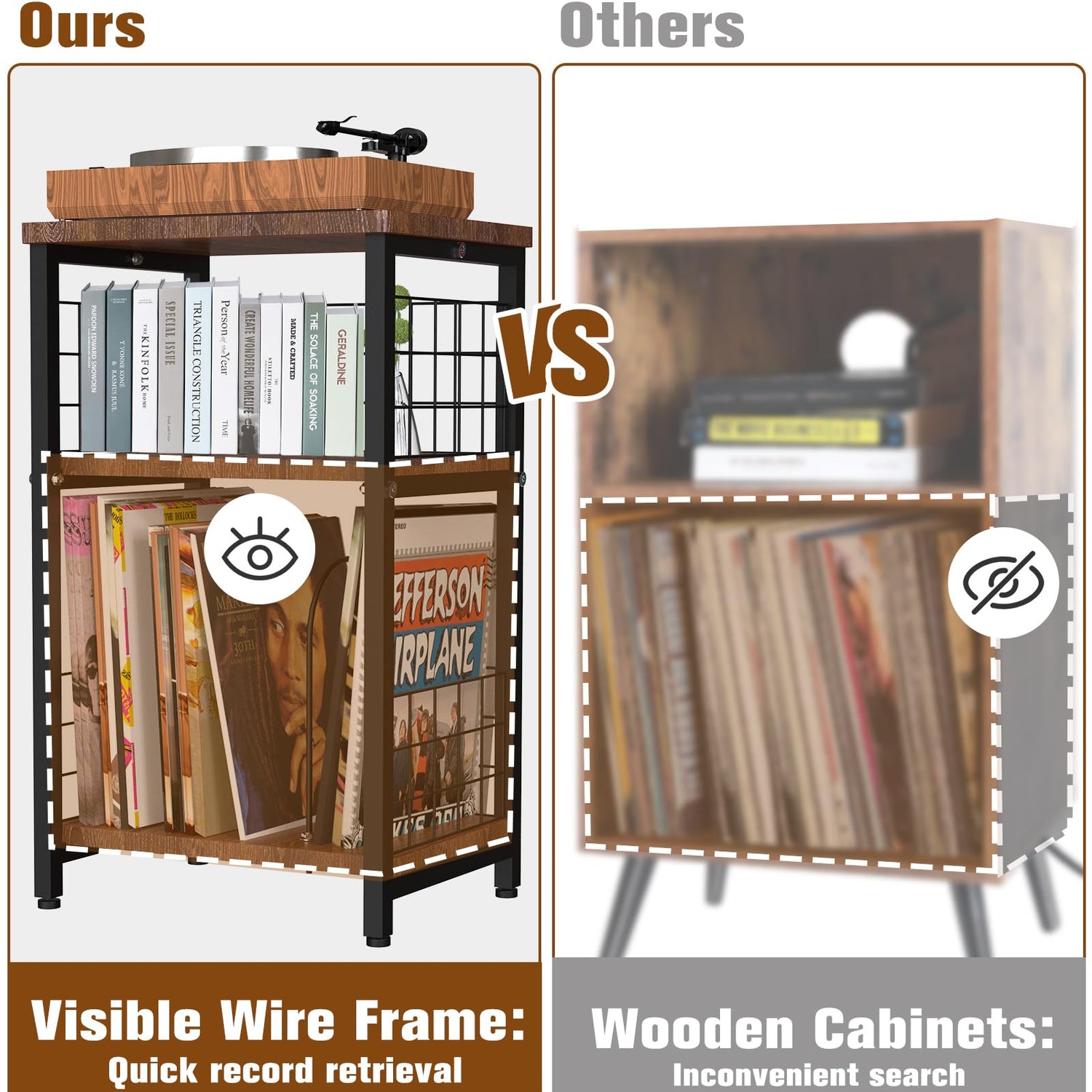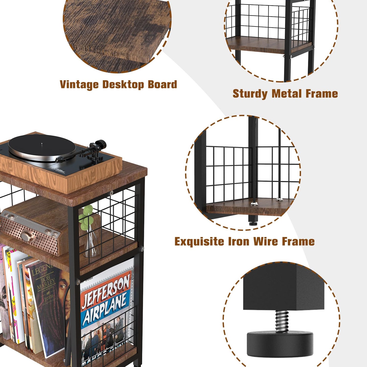 - Aesthetic Appearance & Practical: This record player table is a visual masterpiece that blends into any interior setting. With its vintage design and modern accents, it enhances the aesthetic appeal of your room, while complementing modern décor trends seamlessly. The third layer Iron wire frame and U-shaped wire can protect your vinyl records from falling or slipping. The designated compartments or shelves allow for convenient categorization based on genres, artists, or release years. This feature ensures easy access to your records and enables you to maintain an orderly collection.