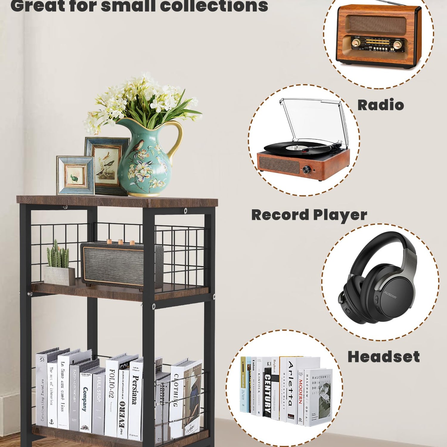 On the wooden phonograph stand, it allows you to separate the items on each tier, making it more convenient to access them.