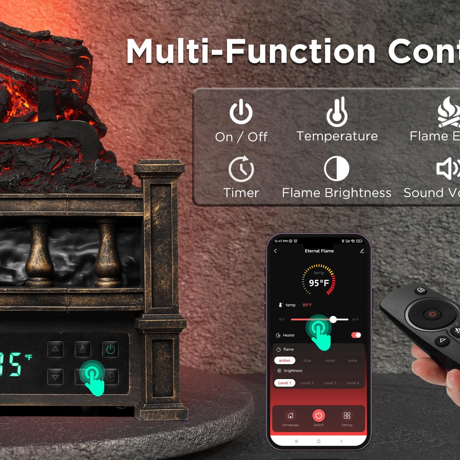 - š„Smart WIFI Control: Effortlessly control the fireplace via the included remote or your smartphone, adjusting temperature and flames from anywhere in your home.