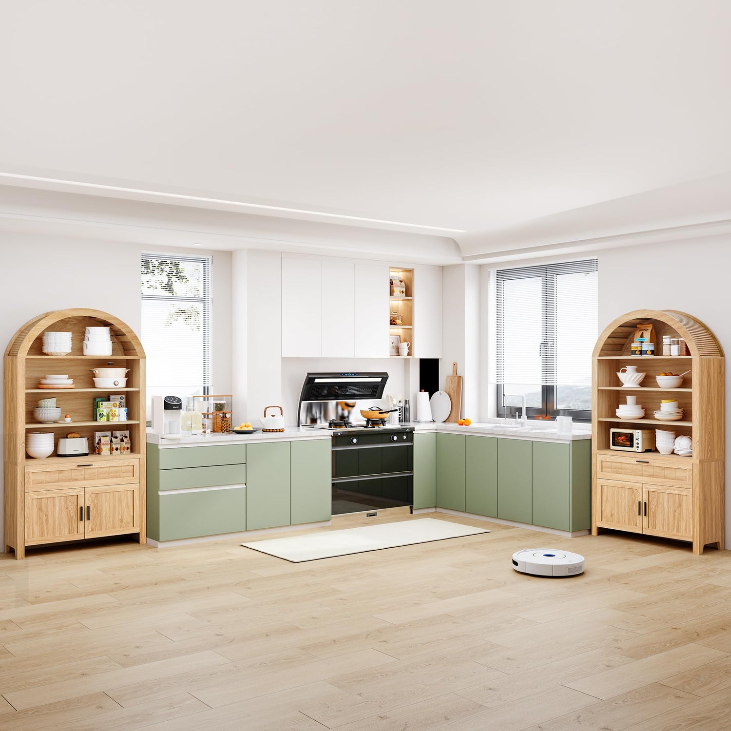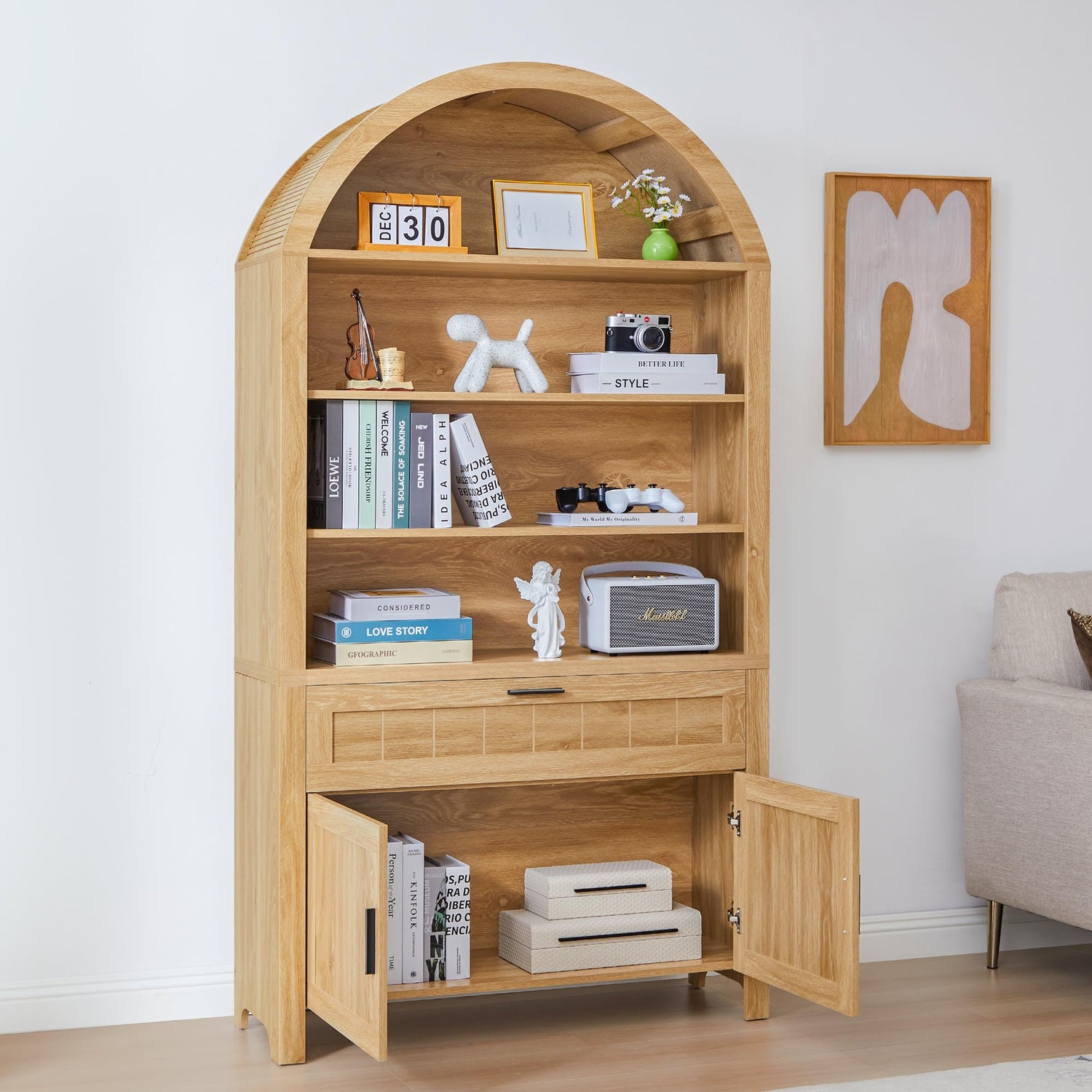 - Elegant Design: This arched bookshelf combines vintage charm with modern utility, featuring a mid-century modern bookshelf design with arched detailing, storage cabinets, and drawers for versatile organization.