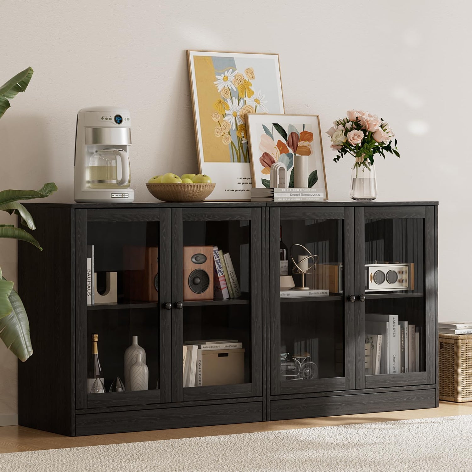 TUSY 4-Piece Large TV Stand with Bookshelves for TVs up to 75", TV Entertainment Center Media Center with Tempered Glass Doors and Shelves, TV Hutch for Living Room (Black)