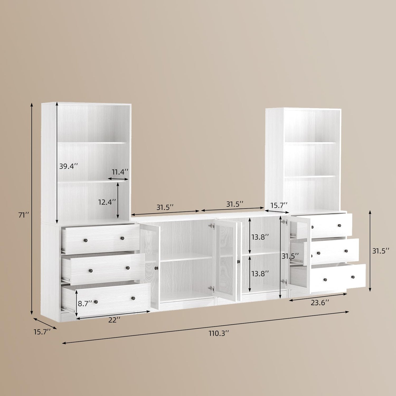 - [DIMENSIONS - FIT]: The TV console: 63”W x 15.7”D, overall dimensions of the entire unit: 110”W x 15.7”D x 71”H, NOTE: The entire unit will come in 4 boxes separately