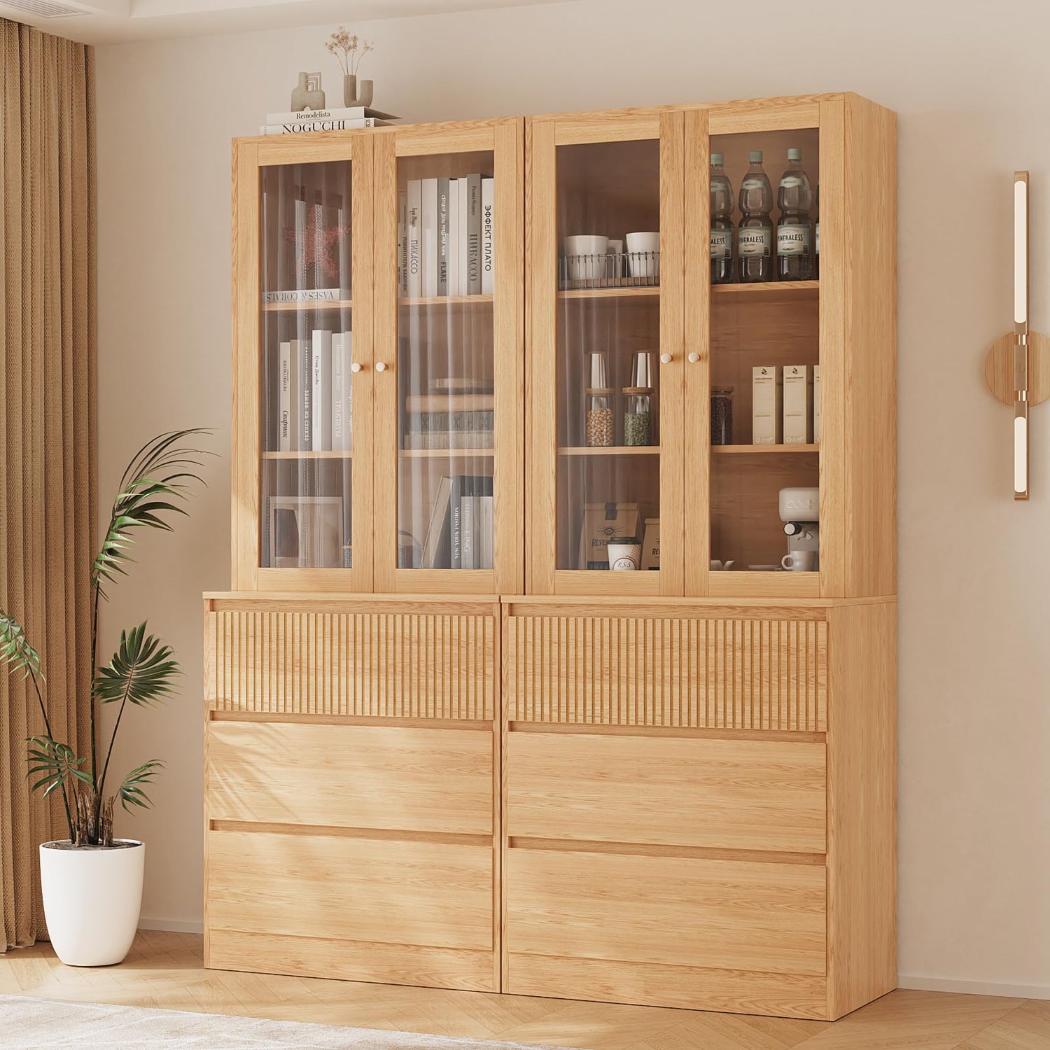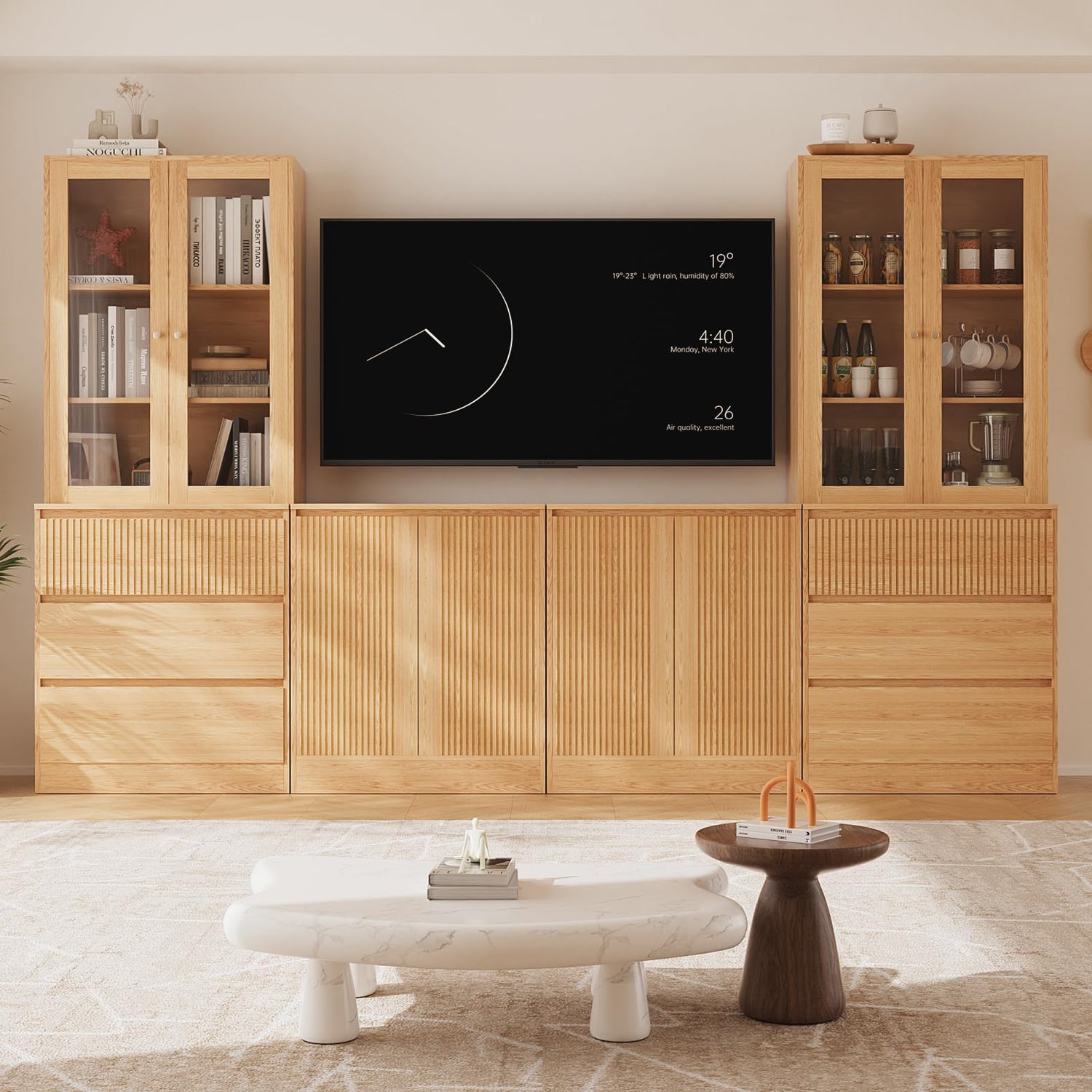 TUSY 4-Piece Large TV Stand with Bookshelves for TVs up to 75", TV Hutch with Tempered Glass Doors and Shelves, TV Entertainment Center Media Center with 2 Tall Cabinets for Living Room (D+2G+D)
