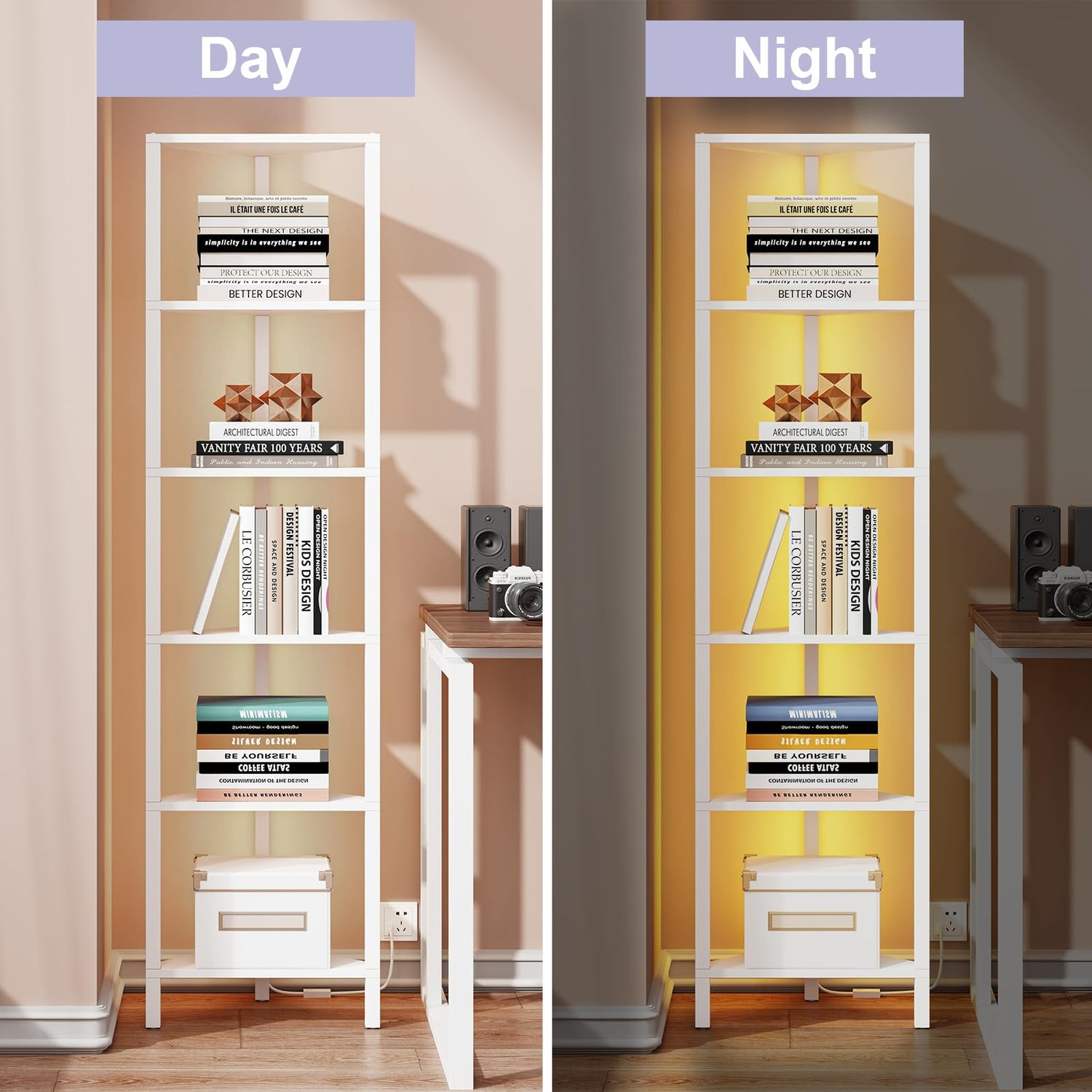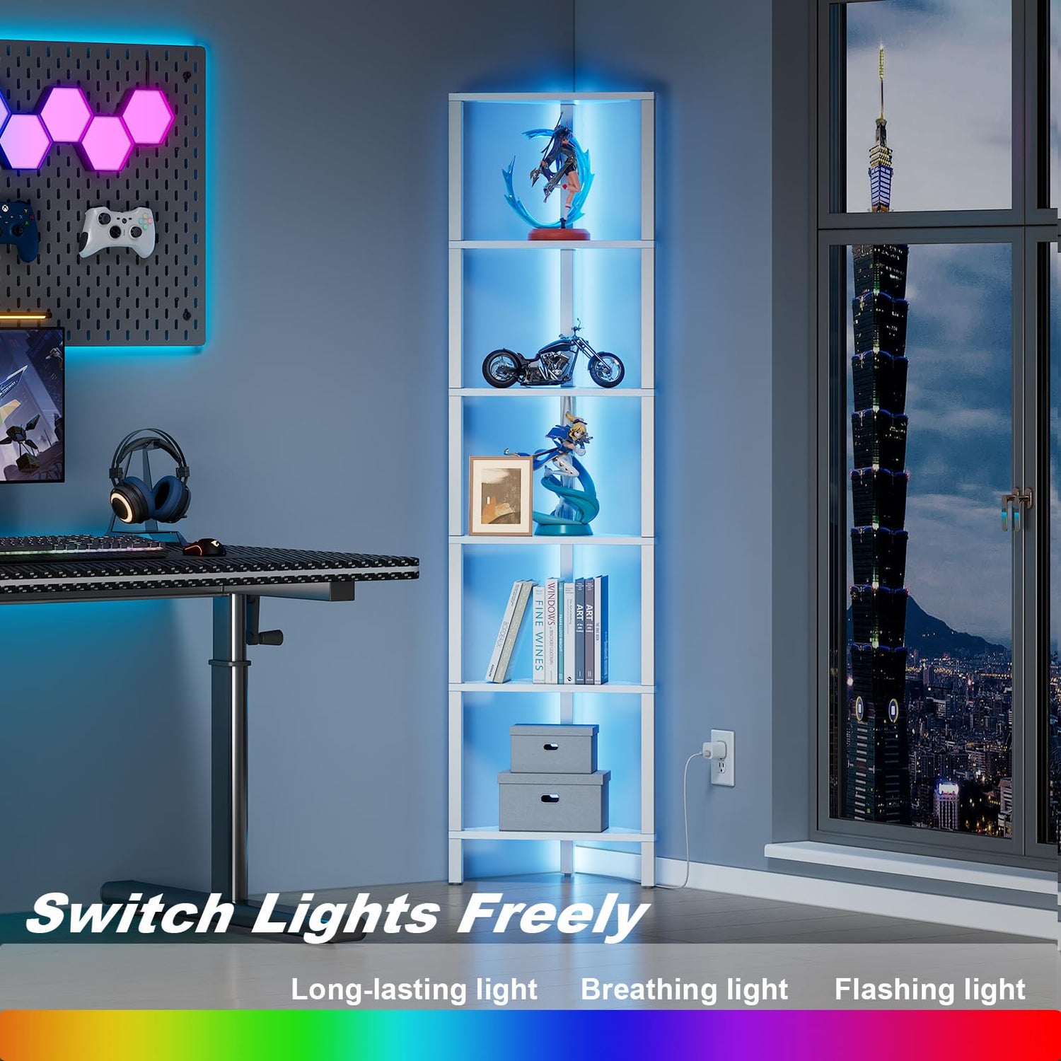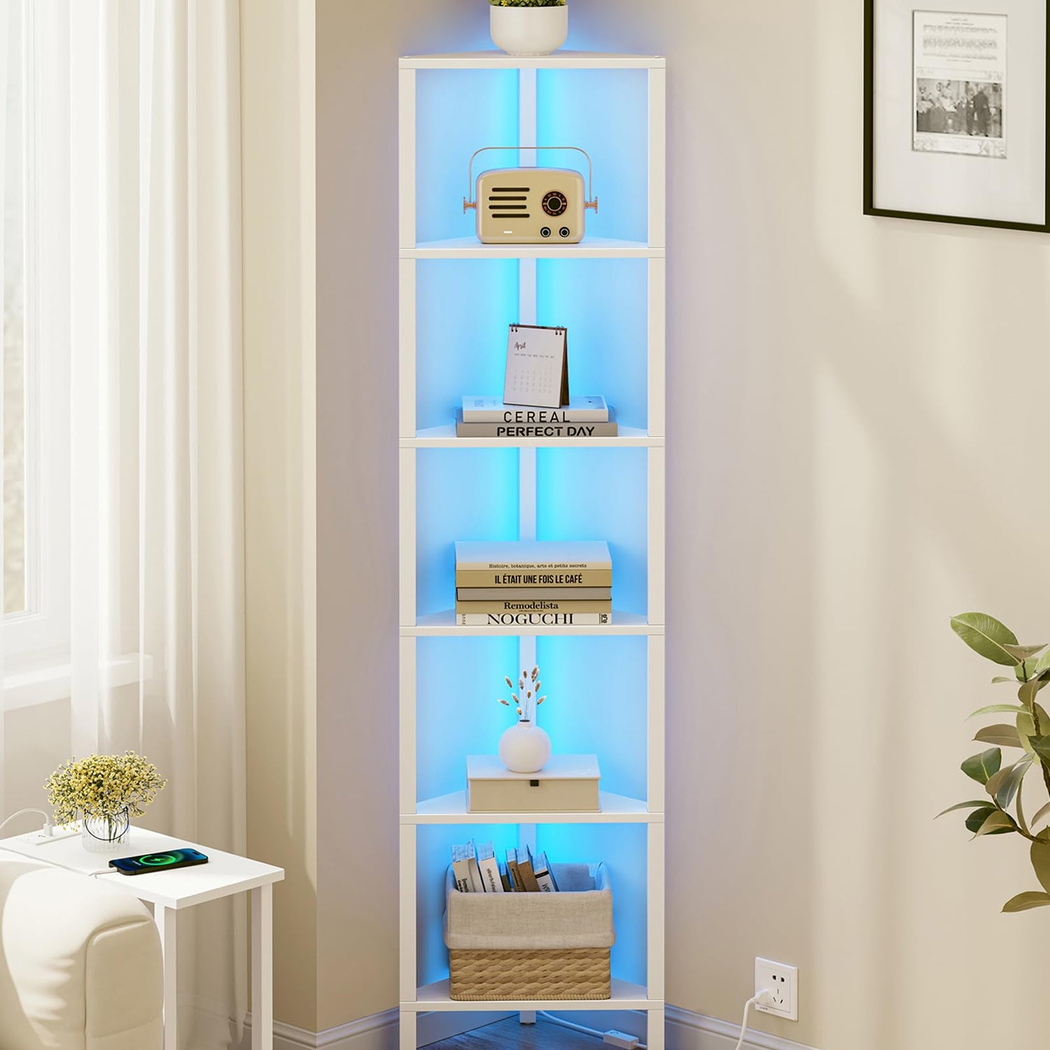 TUTOTAK 6-Tier Corner Bookshelf with LED Light,Corner Shelf for Small Space, Narrow Display Corner Shelf Stand with Storage Rack, for Living Room, Bedroom, Pure White V1BS05BW006L