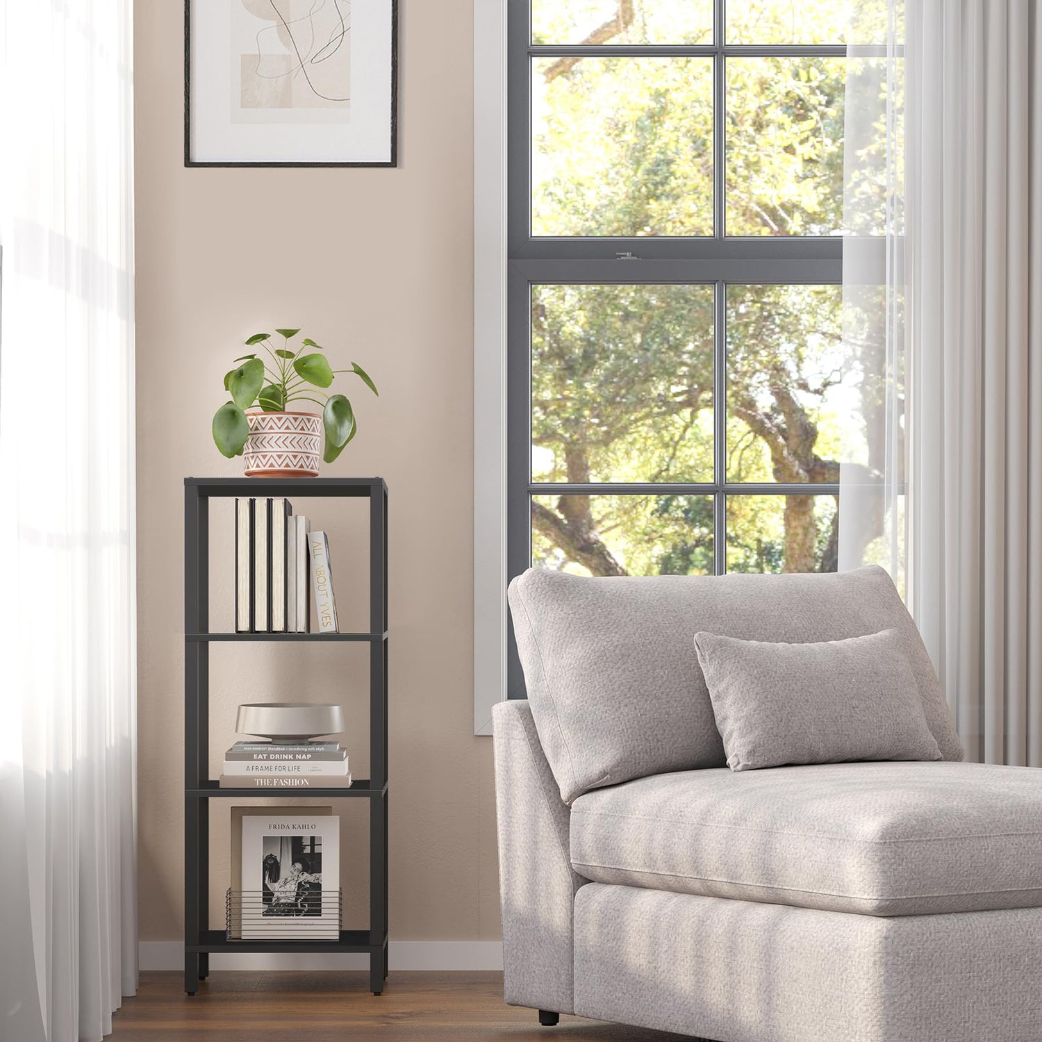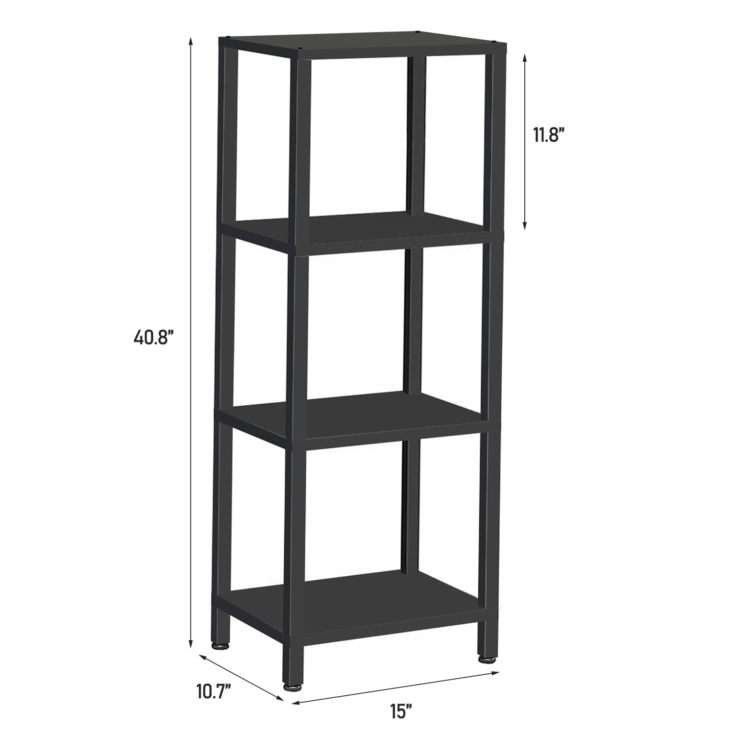 - [More Storage Place] Size:9.4"D x 15.7"W x 42.1"H Our 4 Tier book shelf provides large storage area for your multiple items, books, family photos, frames, devices, utensils. You can use this thin bookshelf to put your favorite books, crafts, photo albums. This bookcase is compact and lightweight without occupy much space,you can use it at anywhere you need to better organize your messy items.