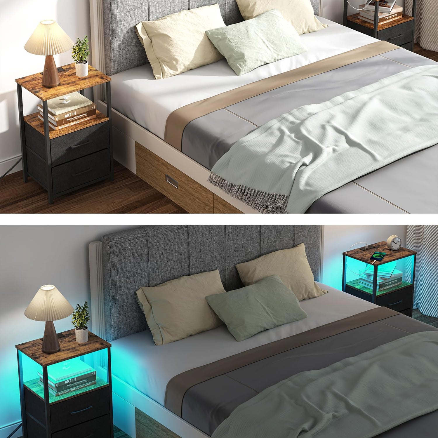 - [2 Large Fabrics Drawers] The bedroom nightstand has and two open shelves for your magazines, boxes, and general living room knick-knacks, and 2 Fabric drawers for private stuff. The practical drawer easily goes in and out. It also arouses a guest’s curiosity.