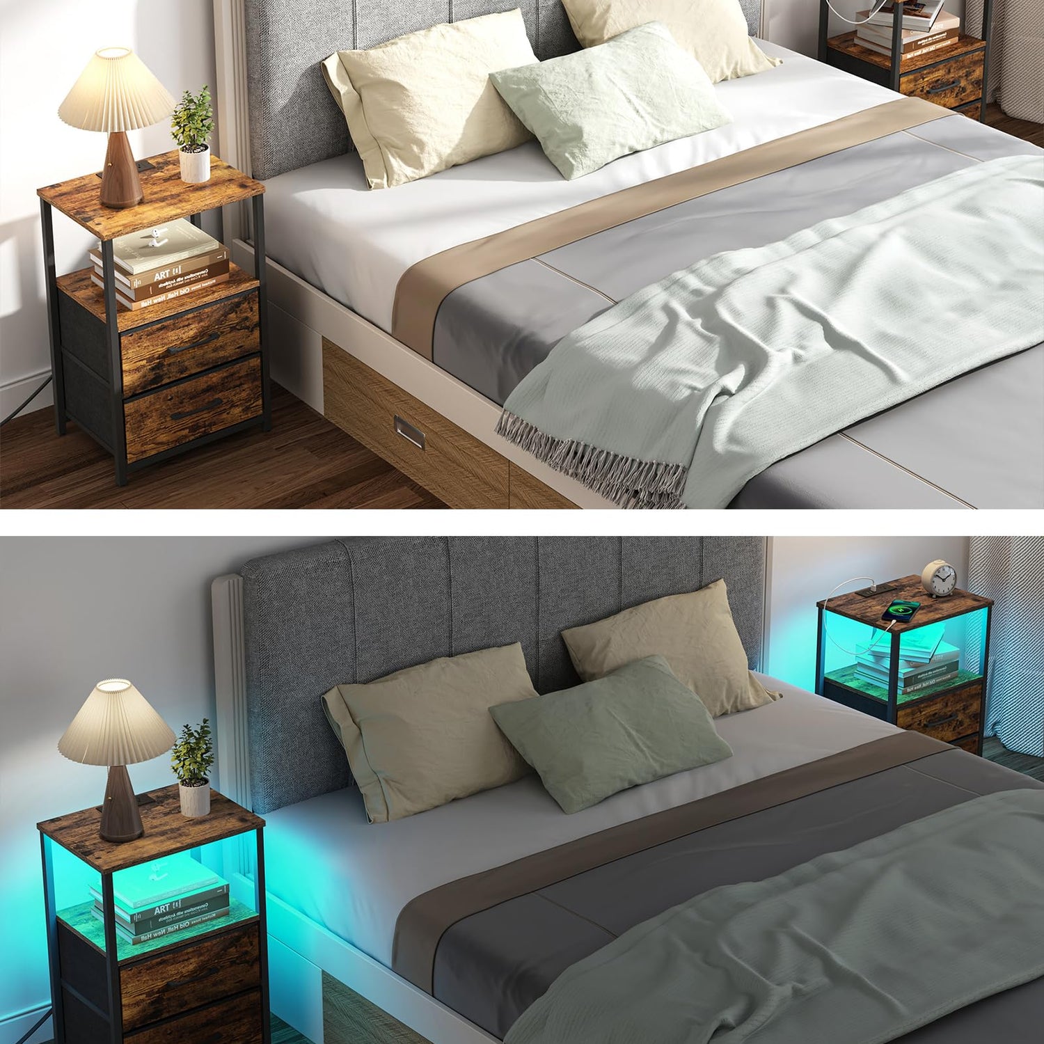 TUTOTAK LED End Table with Charging Station, Nightstand with Cloth Drawer, Side Table with 1 USB Port and 1 Type-C Port, Set of 2, Couch Table, Brown TB01BB052L