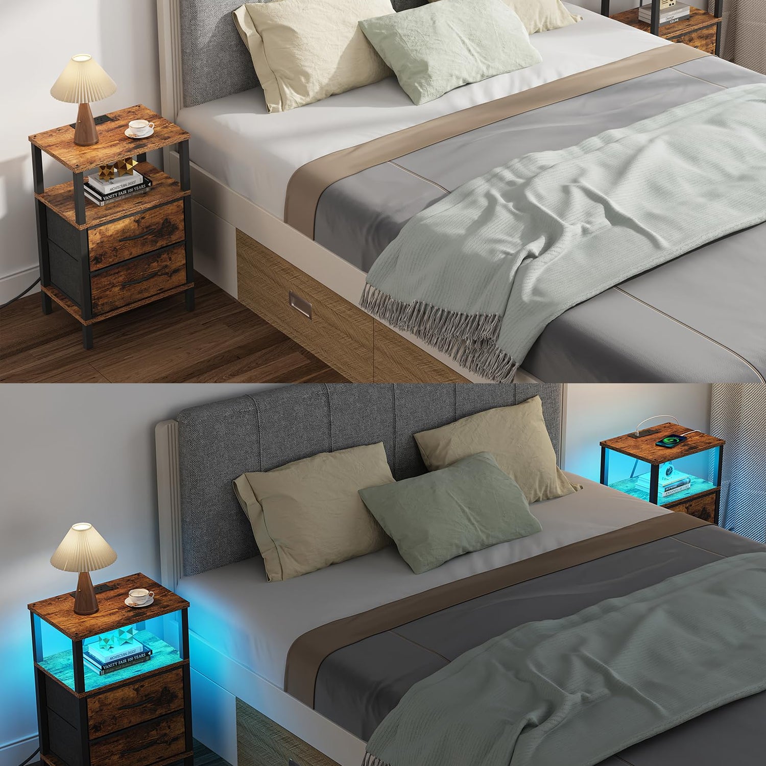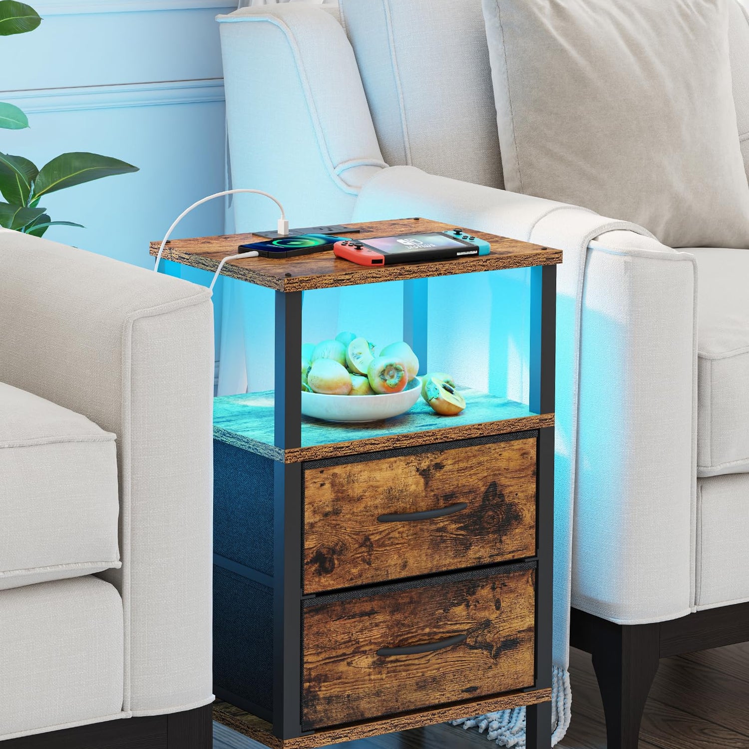 TUTOTAK LED End Table with Charging Station, Nightstand with Cloth Drawer, Side Table with Outlets, Set of 2, Couch Table, Brown TB01BB068