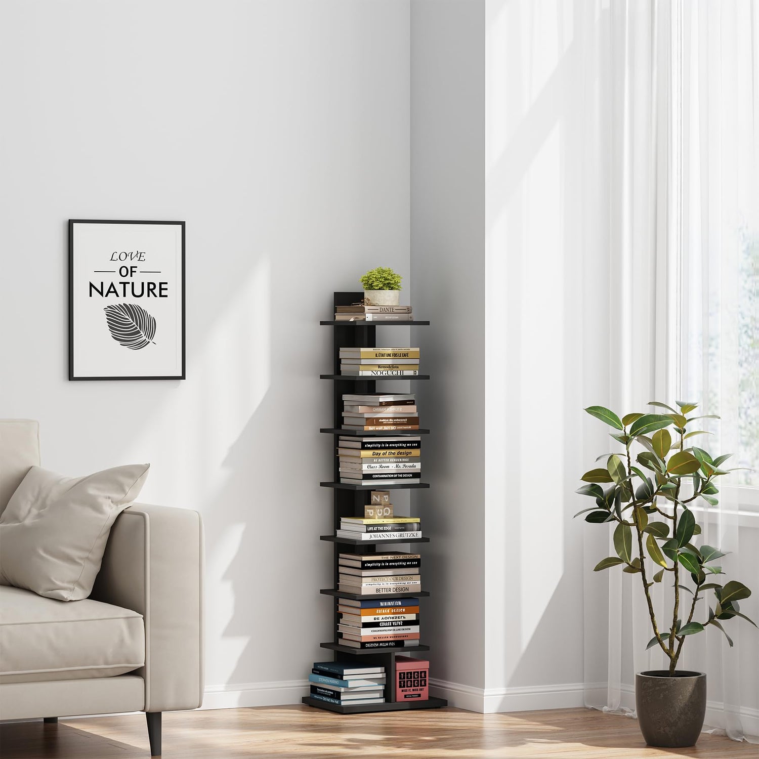 TUTOTAK Narrow Bookshelf, 8-Tier Bookcase, Spine Book Shelf for Small Space, Corner Standing Shelf for Living Room, Office, Study, Entryway, Black BS06BK008