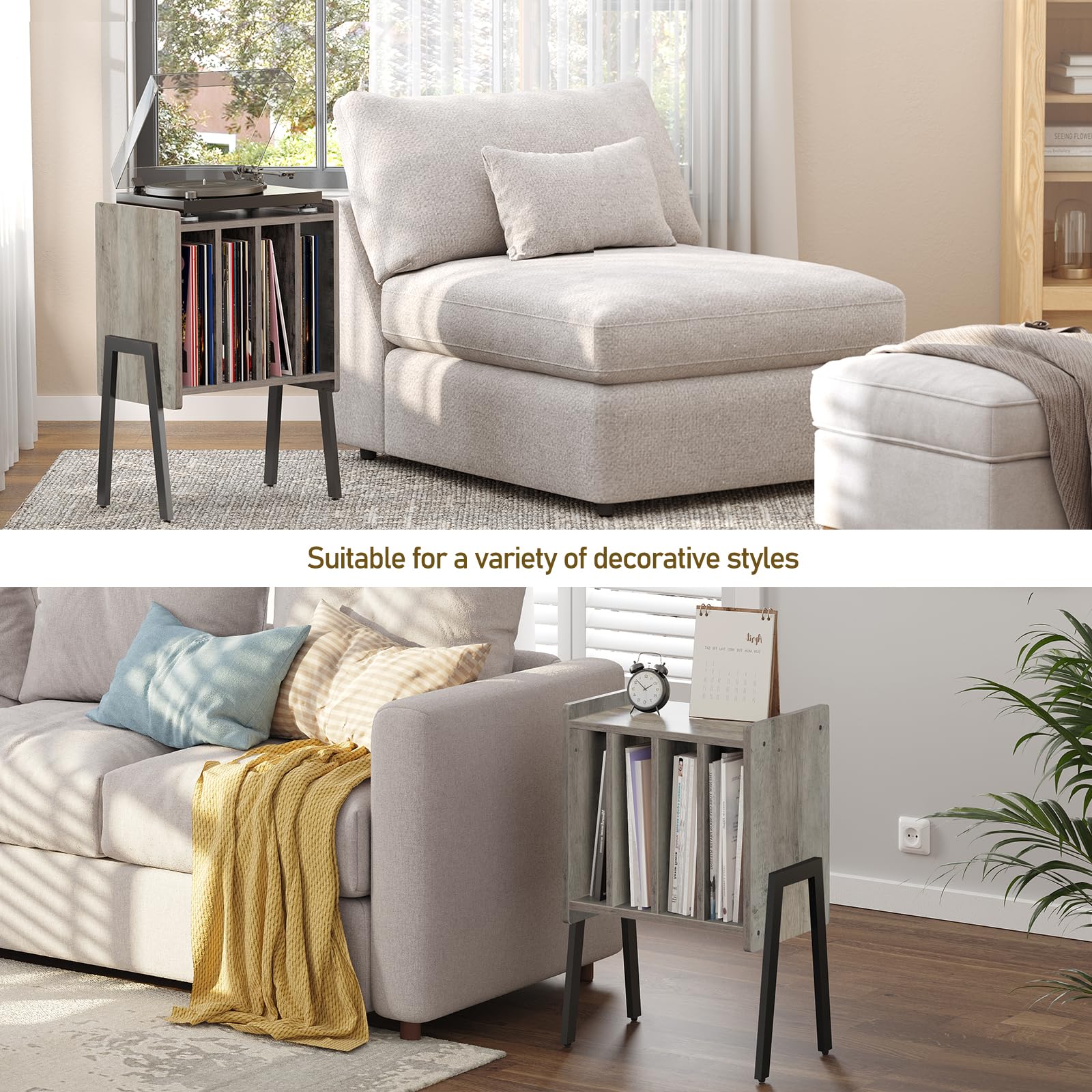 - [Large Storage Space] This record player stand with vinyl offers ample space for storing your record player, albums, and can be used to place items like lamps, books, magazines, and home decor. It meets your different storage needs. Also, The 4 open compartments can separate them according to demand. Being able to display the facades of vinyls, it's easy to find the record vinyl you want.
