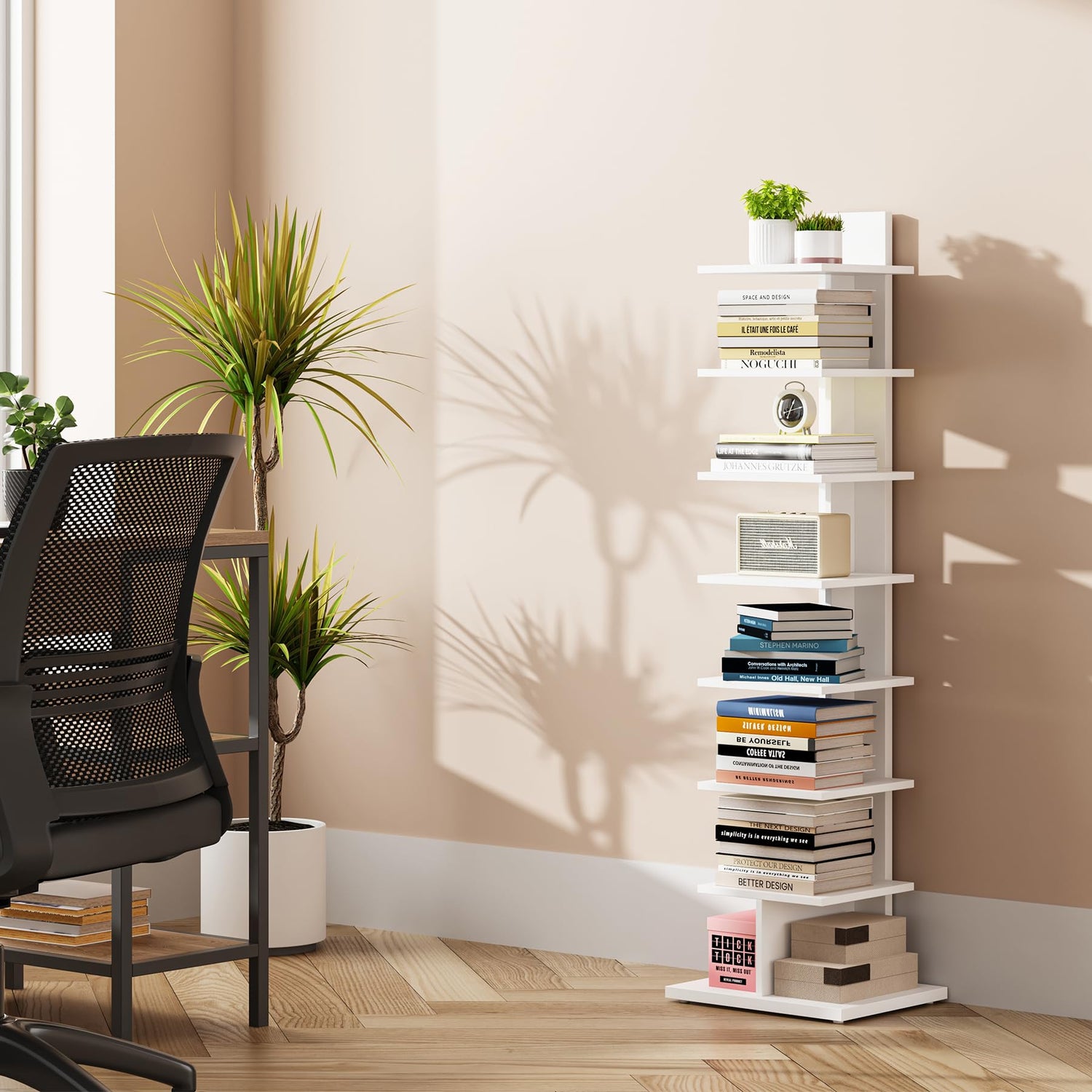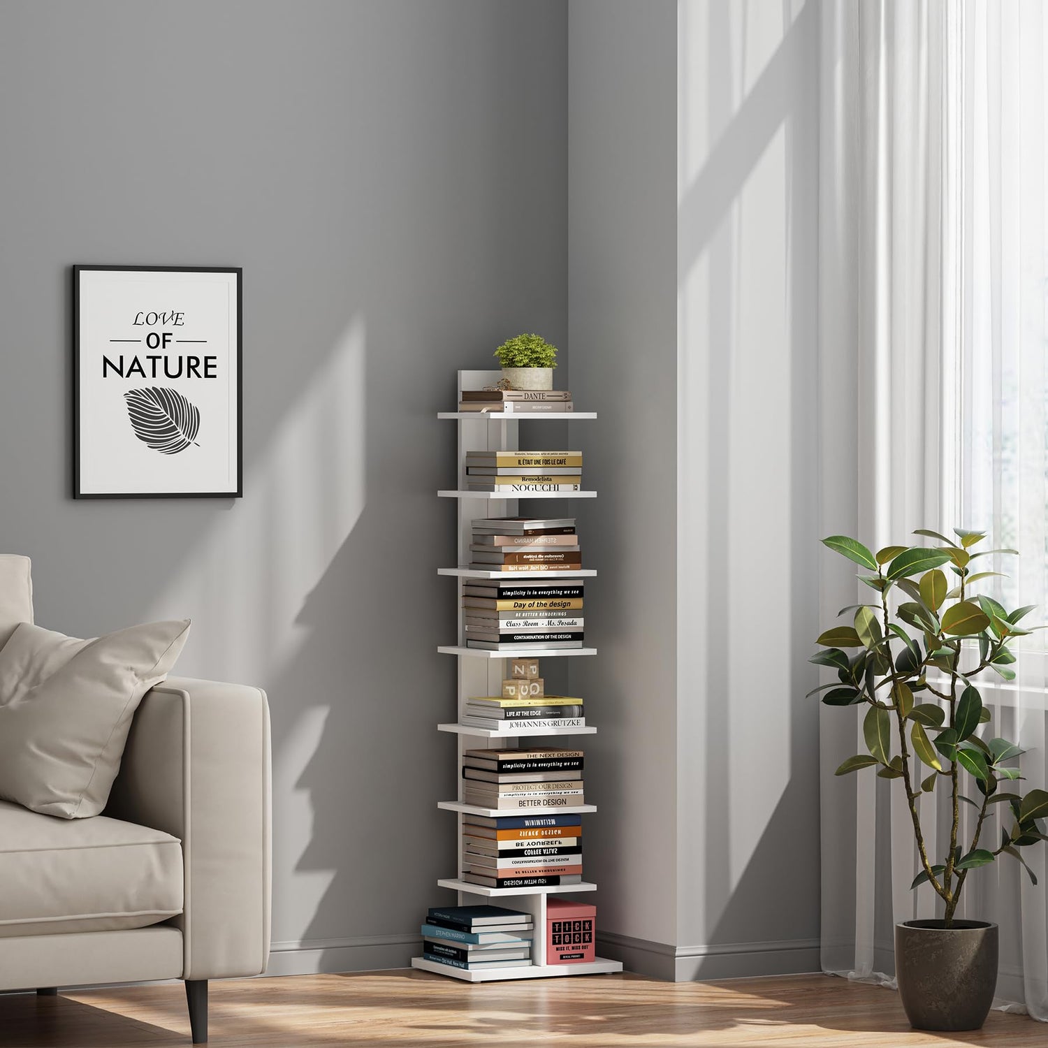 TUTOTAK Vertical Bookshelf, 8-Tier Bookcase, Narrow Spine Book Shelf for Small Space, Corner Standing Shelf for Living Room, Office, Study, Entryway, White BS06BW008