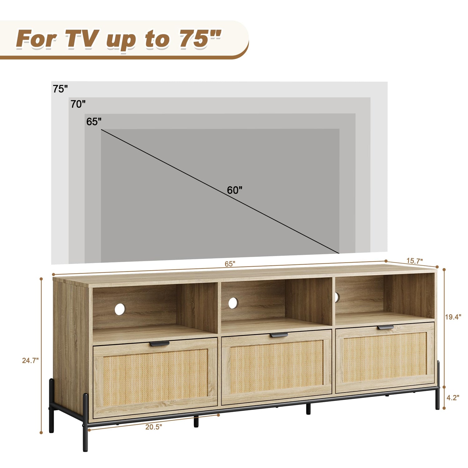 TV Stand for 75 inch TV, Entertainment Center with Storage, 65 Inch TV Console Table with 3 Drawers, Rattan Media Console Cabinet with Metal Legs, Wooden TV Stands for Living Room, Bedroom - Oak