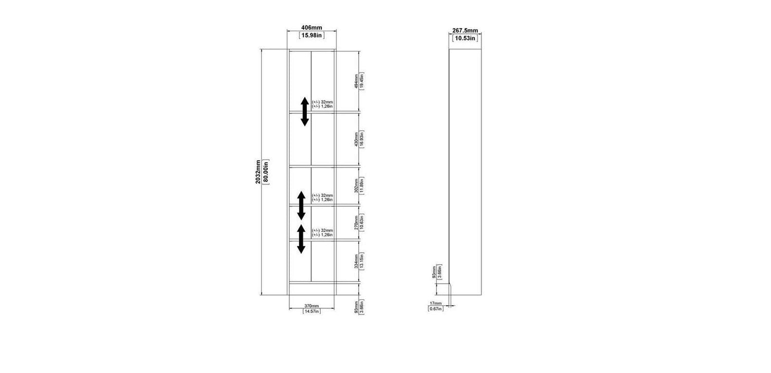 • Tall, narrow sleek design, Five shelves to display your books and knickknacks; Product is shipped in 1 box; Made from engineered wood; Made in Denmark; Scandinavian look and design; Dimension 10.50"L x 16.00"W x 80.00"H