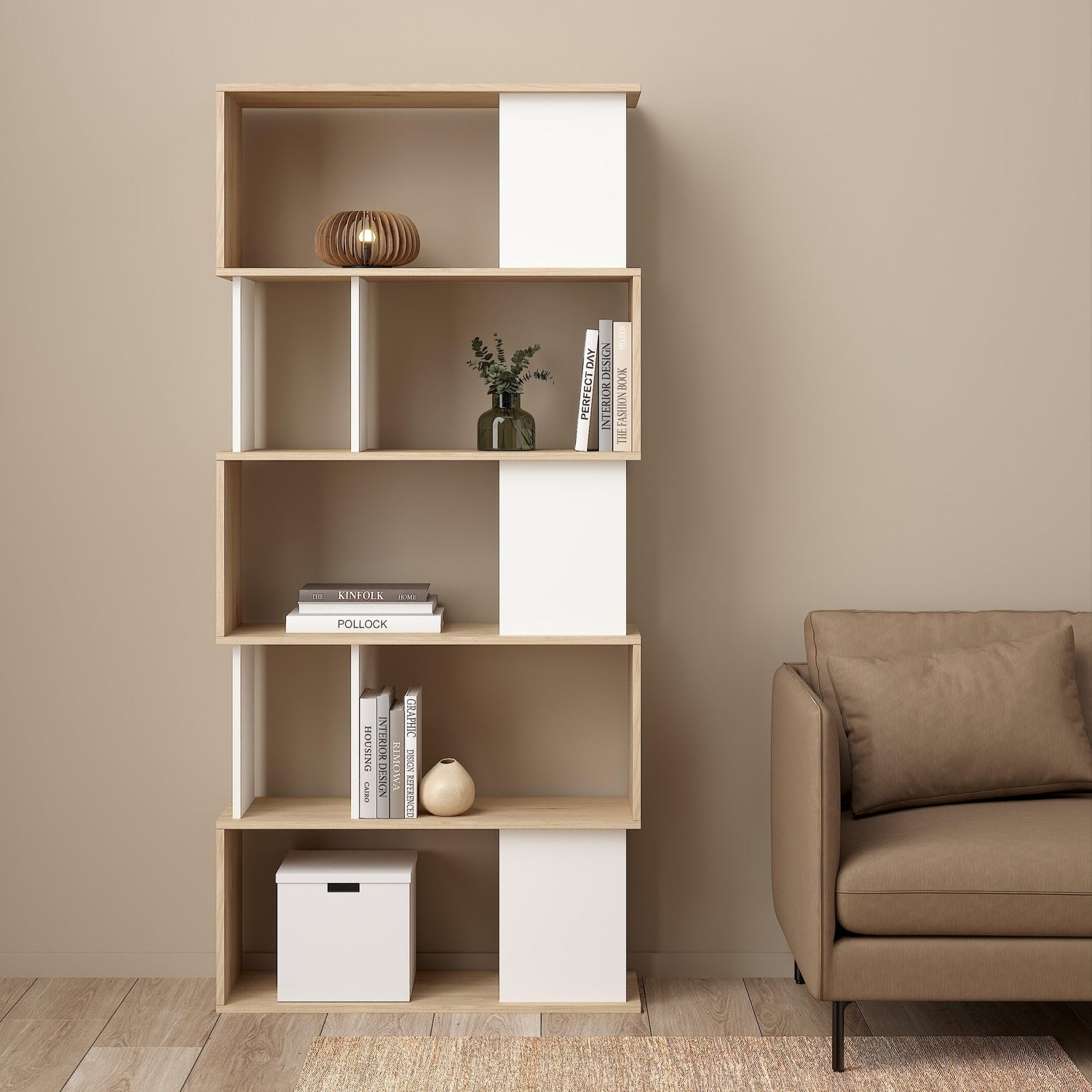 Tvilum Maze Modern Bookcase, Display Shelf and Decorative Room Divider with 7 Fixed Storage Shelves in Oak and White