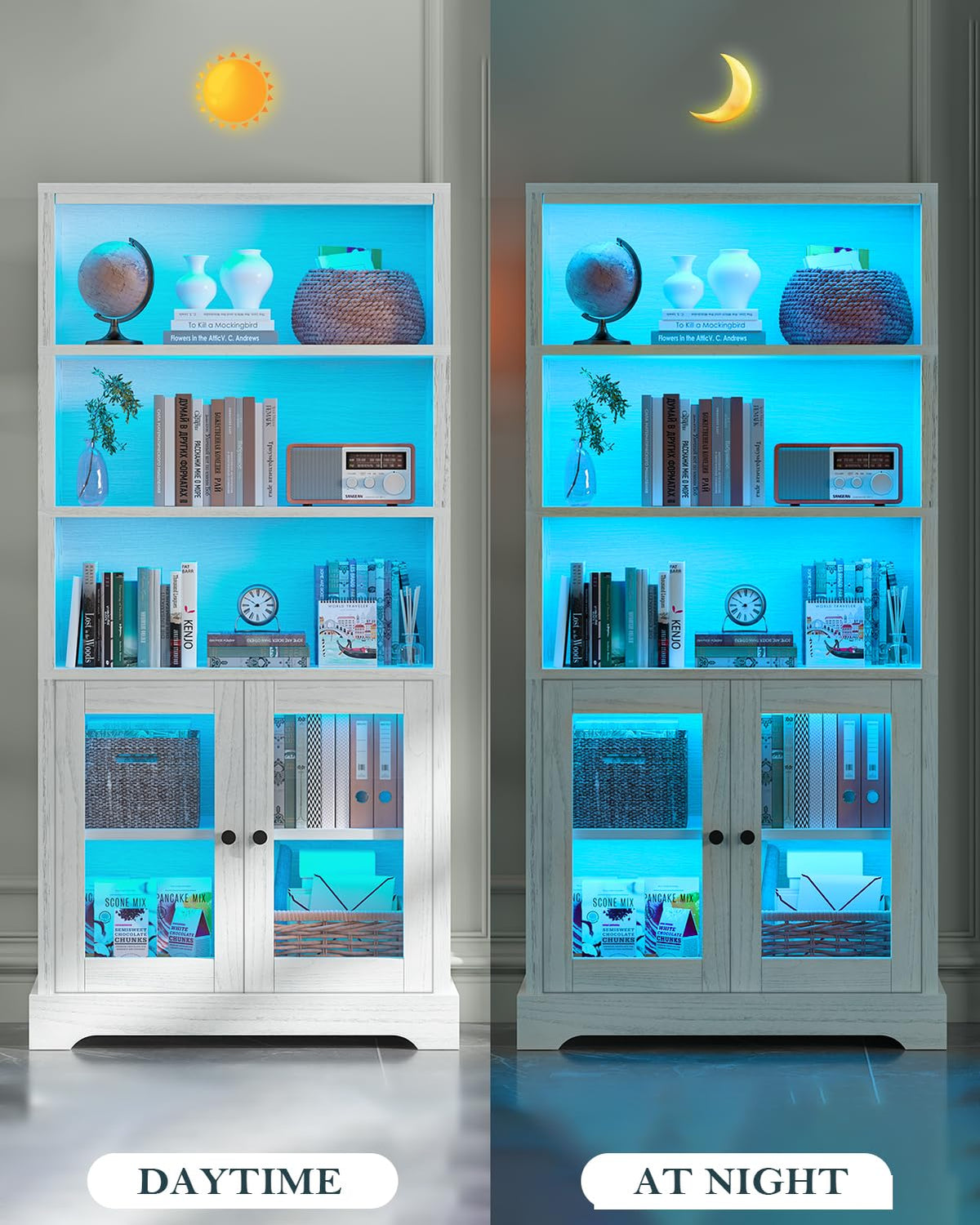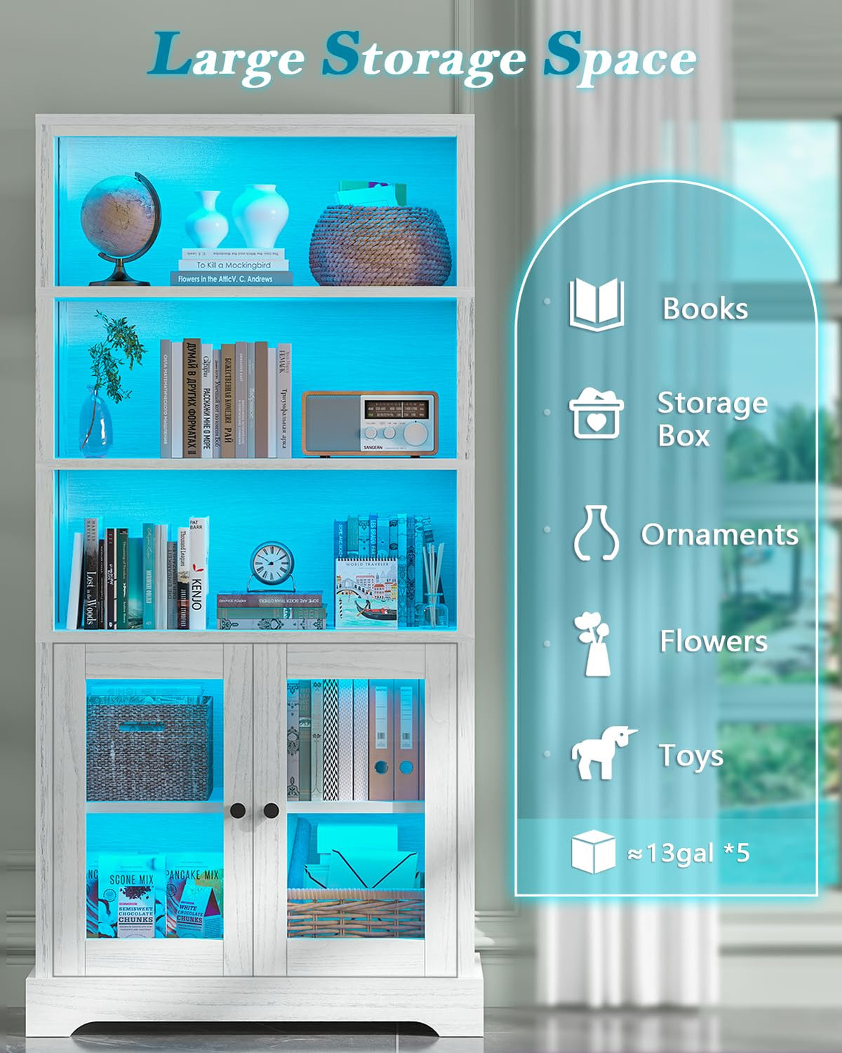 TVU 5-Tier Bookcase with Cabinet & LED, Wood 65 Inch Tall Bookshelf with Storage, Floor Standing Display Book Shelf for Living Room, Office, Study, Entryway (Antique White)