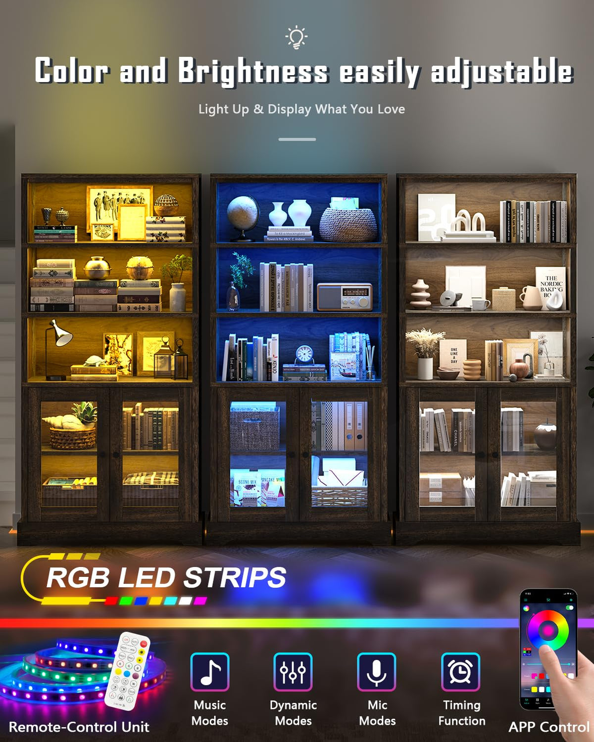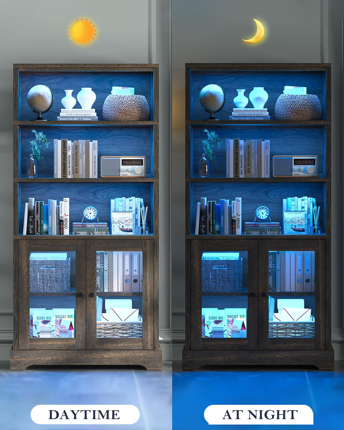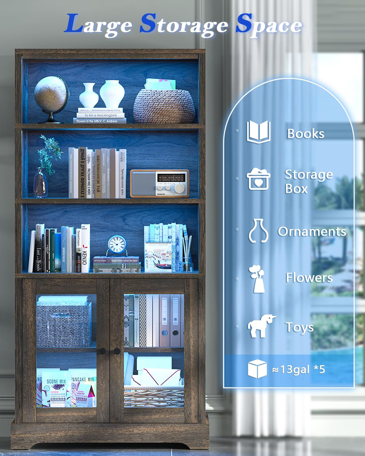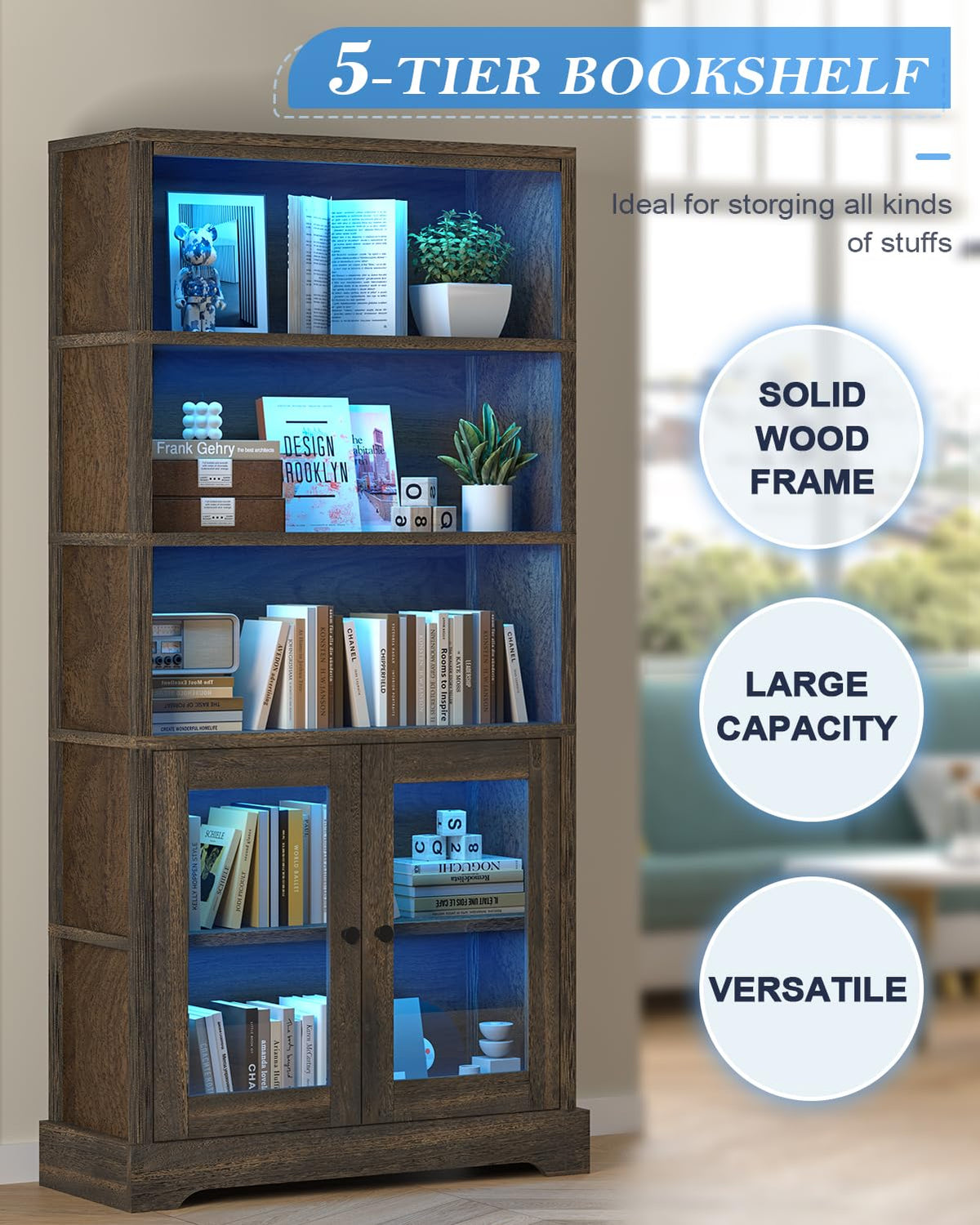 TVU 5-Tier Bookcase with Cabinet & LED, Wood 65 Inch Tall Bookshelf with Storage, Floor Standing Display Book Shelf for Living Room, Office, Study, Entryway (Rustic Brown)