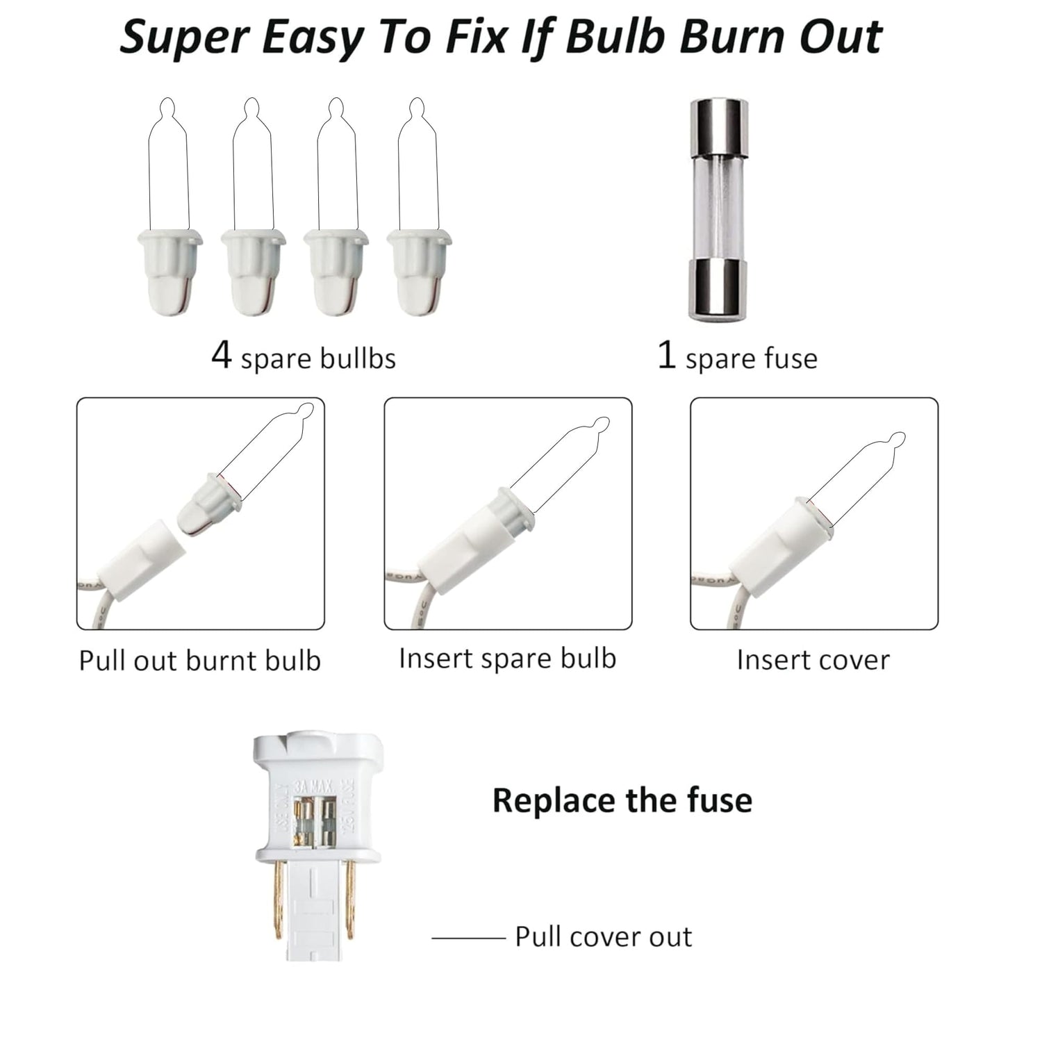 - High Quality: The Christmas tree lights come with a built-in 3A fuse and are UL certified. Each bulb operates independently, ensuring that the rest will continue to function even if one bulb is defective. Simply replace the faulty bulb with a spare one.